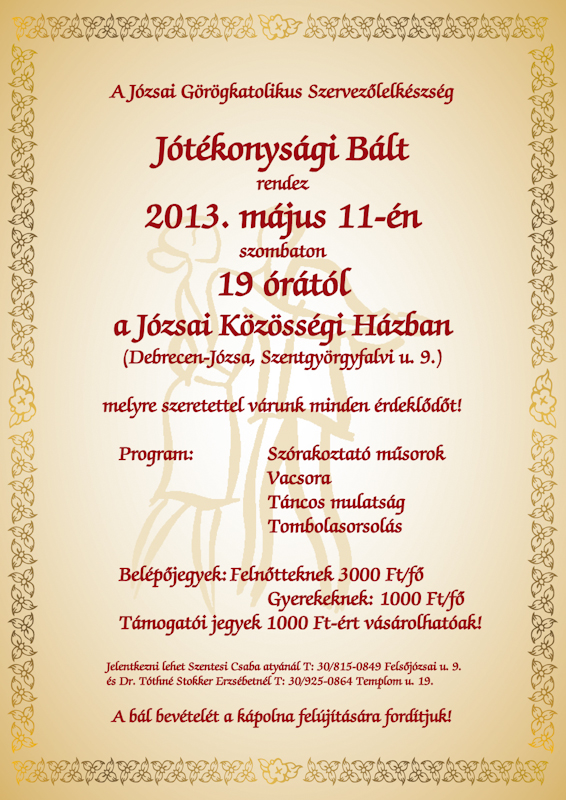A Debrecen-józsai Görögkatolikus Szervezőlelkészség Jótékonysági Bált rendez 2013. 05. 11-én a Józsai Művelődési Házban, melyre szeretettel várunk minden érdeklődőt! További információ a mellékelt plakáton található.