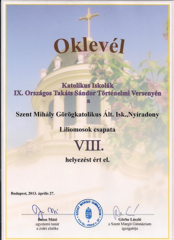 2013. április 27-én a budapesti Szent Margit Gimnázium adott otthont a Katolikus Iskolák IX. Takáts Sándor Országos Történelmi Versenyének. Az idei év témája az Anjouk és a lovagkor Magyarországon volt. A múlt év őszén kezdődött megmérettetésen 55 iskola 4 fős csapatai mérték össze tudásukat. A három fordulóból álló írásbeli feladatok sikeres megoldását követően 12 csapat kapott meghívást az országos döntőre. Iskolánk, a nyíradonyi Szent Mihály Görögkatolikus Általános Iskola csapata, a Liliomosok volt az egyetlen a görögkatolikus iskolák közül, amelyik az országos döntőbe bejutott. A 7. osztályosokból álló négyes tagjai voltak: Babulák Dávid, Bodogán Zsófia, Szabó Fanni és Szemán Renáta 7. osztályos tanulók. Őket Topor István magyar-történelem szakos középiskolai tanár készítette fel a versenyre. A nagy múlttal rendelkező iskolák között sem vallottunk szégyent. A nemes vetélkedésben elért VIII. helyünk is mutatja, volt értelme a kemény munkának. Köszönjük az iskolavezetés támogatását, amelynek eredményeként részt vehettünk ezen a nagyszerű rendezvényen.