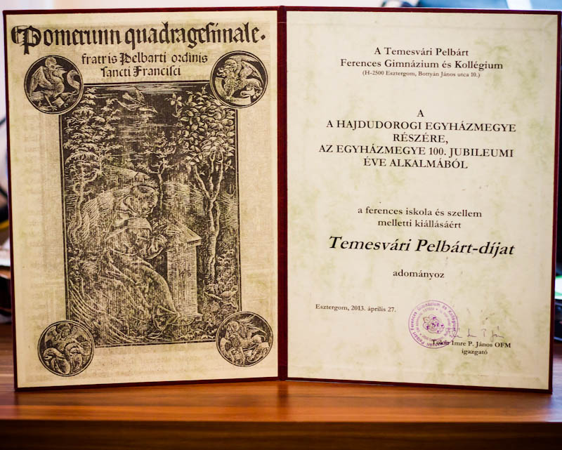 A Szent Liturgia kezdete előtt kis meglepetés is ért minket, hiszen P. Tokár János igazgató, a diákegyesület elnöke Temesvári Pelbárt-díjat adott át a jelenlévő papság által a Hajdúdorogi Egyházmegyének. Köszönet és hála érte!