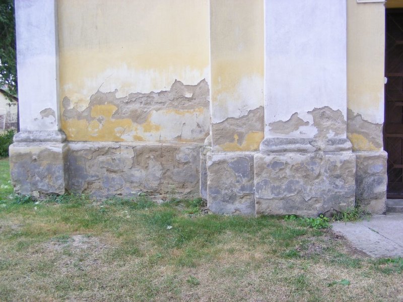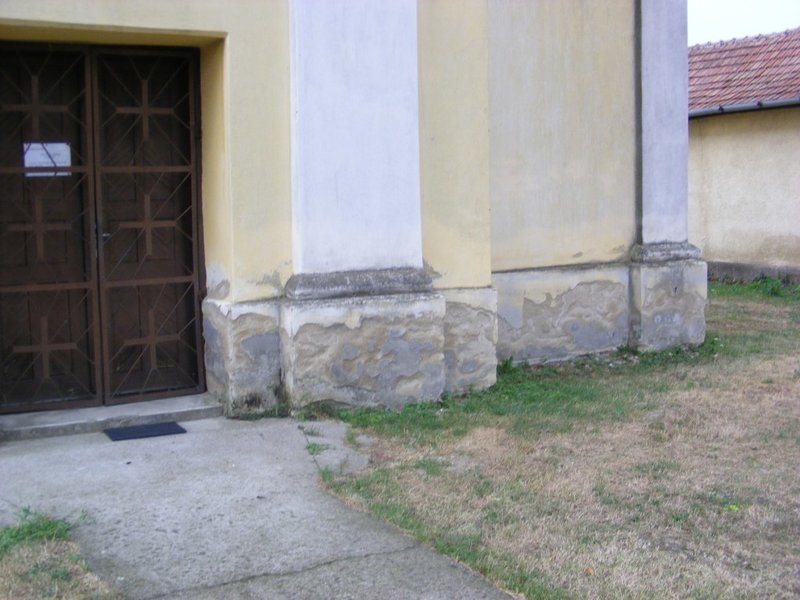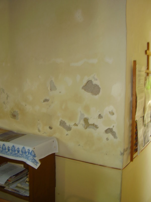 1. A templom utólagos szigetelése a talajvíztől. A vakolat alul lehullott, belülről vizesedik a fal.