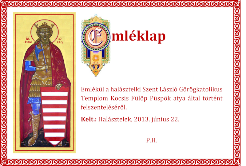 Június 22-én, szombaton a Csepeli Görögkatolikus Egyházközség halásztelki, most kibővített templomának új szentélyét és ikonosztázát szentelte fel Kocsis Fülöp püspök úr. A Szent Liturgiát követően az egyházközség és Halásztelek város hagyományai szerint a papság és a hívek a Szent László térre indultak körmeneti rend szerint. Ez a nap az egyházközség és Halásztelek búcsúi ünnepe is volt, Szent László király napjának elővételezéseként. A szertartáson részt vettek a római katolikus és református egyházak vezetői, a város elöljárói, nagy számban a görögkatolikus hívek és mindazok, akik az egyházközség örömében osztozni jöttek.