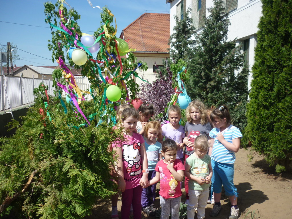 Volt zöldágjárás, tavasz köszöntő néptánc, megválasztottuk a pünkösdi királynét és királyfit, május fát díszítettek és állítottak az apukák és fiaik.