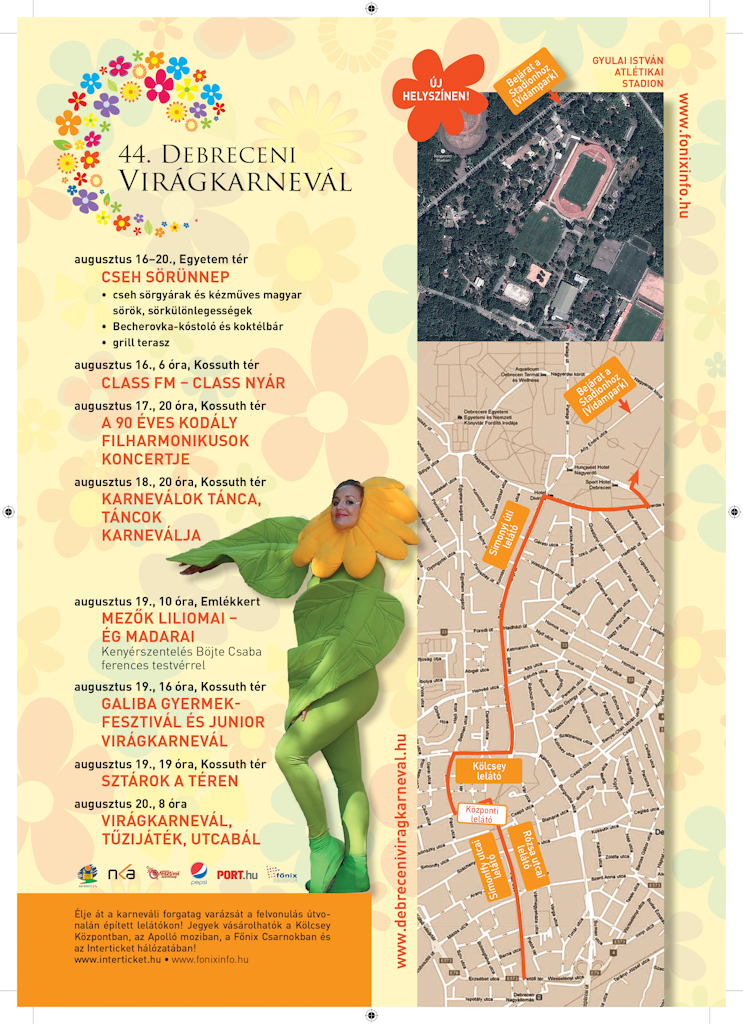 Aki megtekinti az idei virágkarnevál köré szervezett karneváli hét részletes programját a www.fonixinfo.hu vagy a www.debreceniviragkarneval.hu oldalon, azt láthatja, hogy igazi sztárparádé lesz a főtéren. Ingyenes koncertet ad többek között a Hien, Vastag Tamás, Kasza Tibi, Bikini, a Magna Cum Laude, a PG Csoport, Radics Gigi és Charlie is. Fellép még a főtéren a Kodály Filharmónia és a Valcer Táncstúdió is. A Debrecen Hangja döntőjében öt szimpatikus fiatal közül választja ki a győztest a várhatóan több tízezres közönség. Dzsudzsák Alexandra (1-es sorszámmal lehet rá voksolni), Fekete Sándor (2), Kovács Tamás (3), Sebestyén Ádám (4) és Széplaki Éva (5) az Abrakazabra együttes kíséretével lépnek fel augusztus 19-én este fél kilenckor a Kossuth téren. Szavazni augusztus 19-ig lehet a 06/20-20-20-220 nem emelt díjas SMS számra. A győztes, Debrecen hangja egy négyszemélyes utazást kap Dortmundba a Wizz Air felajánlásával és egyprofesszionális stúdiófelvétel elkészítésének lehetőségét. A gyerekek és a családok nagy örömére idén is lesz Galiba Gyermekfesztivál és Junior Virágkarnevál. Sőt, a tavalyi sikeres debütálás után idén több étteremben kínálnak ehető virágból készült ételeket is. Tovább gazdagítja a virágkarnevál gasztronómiai oldalát a Hazai és Cseh Kézműves Sörök Fesztiválja. A Nagyerdőn, a Békás-tó partján öt napon keresztül várjuk a legendás cseh mozifilmek, az autentikus ételek és kézműves sörök szerelmeseit. Vár minden érdeklődőt a vendégszerető debreceniekkel együtt a 44. még szebb, még különlegesebb virágkarnevál!