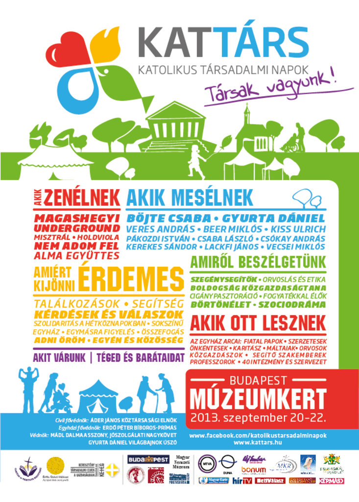 Kerekasztal-beszélgetések, előadások, koncertek, játékok és valódi fesztiválhangulat adják a keretét a Katolikus Társadalmi Napok („Kattárs”) programsorozatnak, amelyet 2013. szeptember 20.-22. között rendeznek Budapesten, a Nemzeti Múzeum kertjében. A „Társak vagyunk!” jelmondattal meghirdetett esemény fő célja, hogy minden érdeklődő számára is bemutassa az Egyház válaszait a társadalom égető kérdéseire és problémáira. A programokról a nemrég elindult honlapon (www.kattars.hu) található bővebb információ.