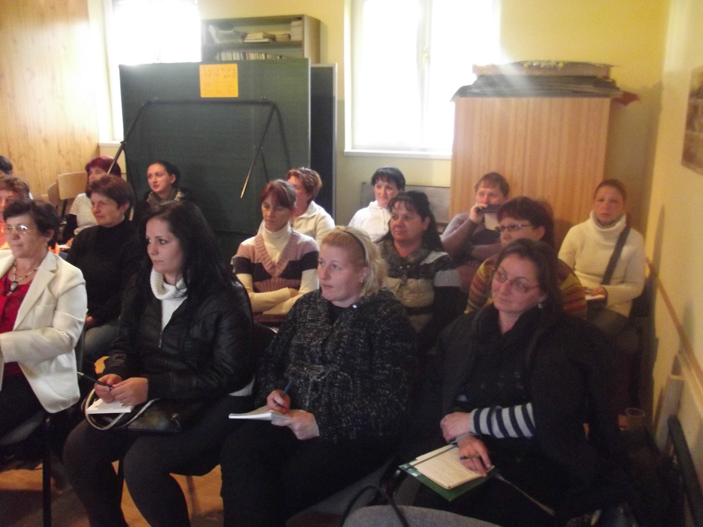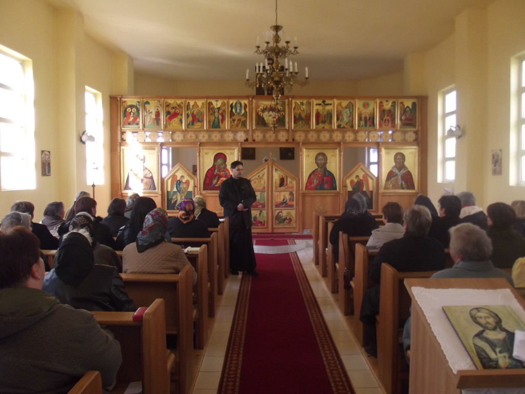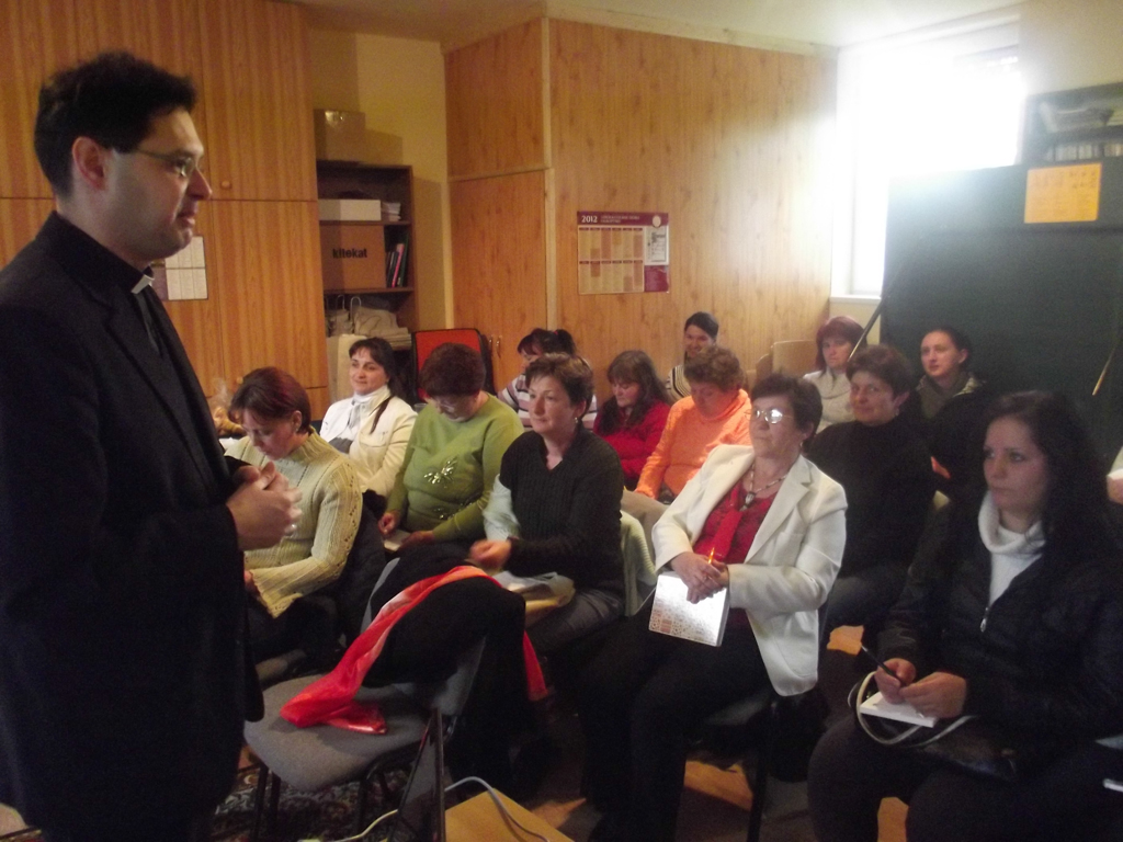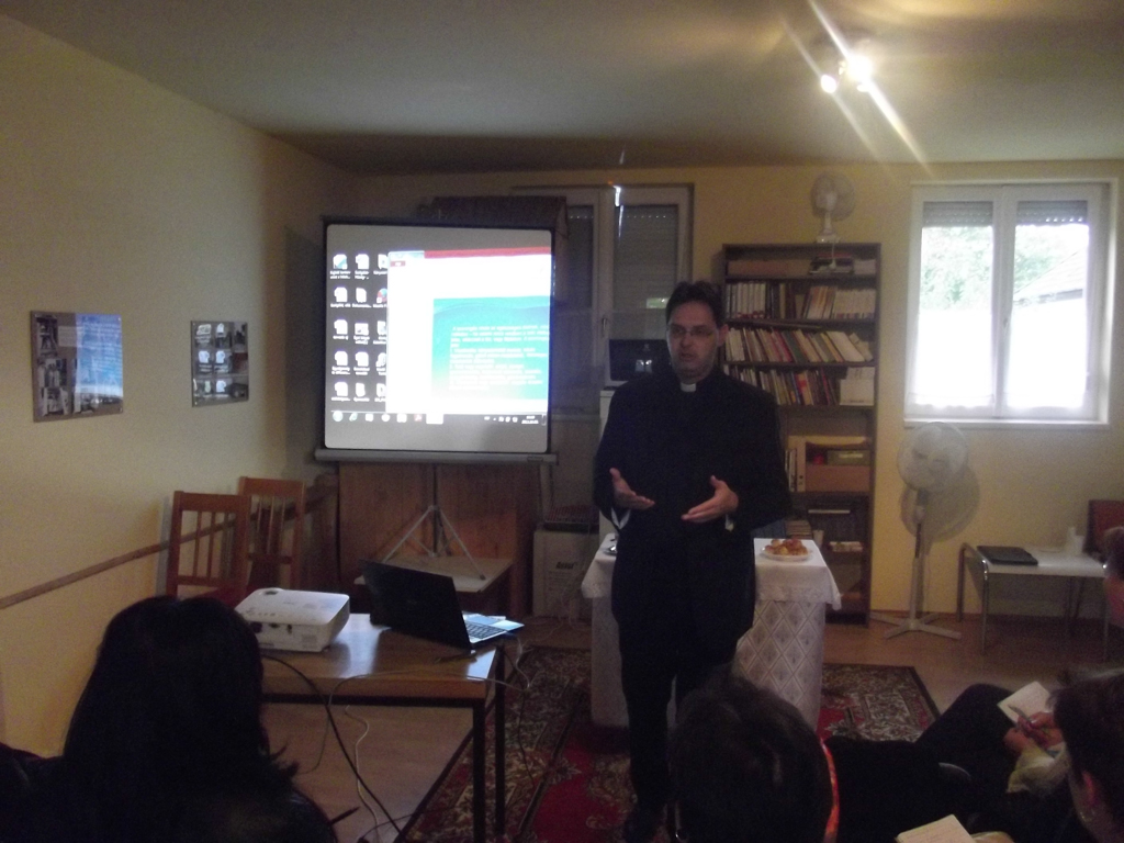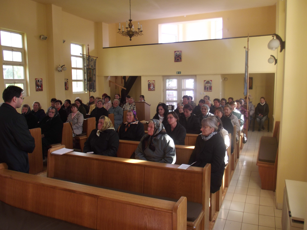 A szolgálat dolgozói gondozottaikkal együtt a munka után, délután, a templomban hallgathattak elmélkedést László atyától. Az atya tartalmas és lélekemelő előadása után közös imádkozással, a Paraklisz elvégzésével fejeződött be a gondozottak és gondozónőik közös programja. Ezt követően a hittanteremben folytatódott a délután szakmai része. Makkai atya a felnőttkori alkalmazkodási zavarok tüneteiről beszélt, hiszen ezen problémák jó része érintheti az idős embereket. Majd a csapatban való közös munka, a csoportként való együttműködés volt a téma. A házi segítségnyújtásban dolgozók elgondolkodhattak arról, mitől tud ez a szolgáltatás más, több lenni, mint más szolgálatok. Az este során lehetőség nyílt kötetlen beszélgetésre is.