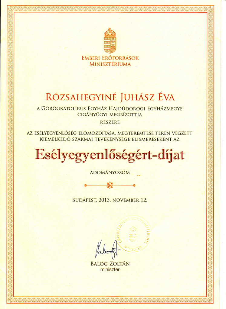 A szociális munka napján, november 11-én, Balog Zoltán az emberi erőforrások minisztere és Soltész Miklós szociális és családügyért felelős államtitkár elismeréseket adott át az szociális élet területén kimagasló tevékenységet folytató munkatársaknak. Egyházunk nagy örömére a díjazottak között köszöntötték Rózsahegyiné Juhász Évát, cigányügyi referensünket is.