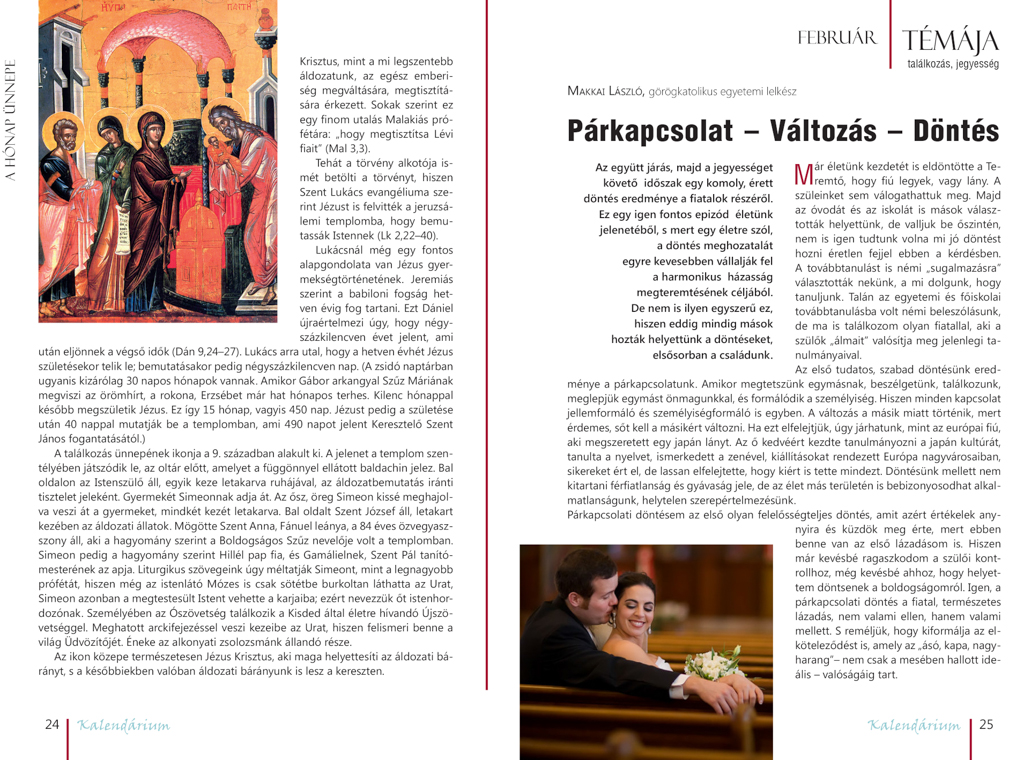 Napjaink követelményihez igazodva ugyanis a színesség, a képies világ uralja az oldalakat, míg a hónapok egy-egy mindennapjainkhoz kötődő téma köré épülnek fel. Így szó esik az otthonról, Isten házáról, a családról, a házasságról, az anyaságról, az idősekről, a hivatásról és munkáról, az örömről és a kultúráról, mely témákba íróink és interjú formájában megszólaló görögkatolikus testvéreink vezetnek be bennünket. De mindezek mellett megismerkedhetünk tizenkét hónapunk görögkatolikus ünnepeivel és kiemelkedő szentjeivel, lelki útmutatást kaphatunk az atyák írásaiból vagy egy-egy szép verssel gazdagodhatunk nagy magyar költőinktől, havonta süthetünk-főzhetünk magunknak és családunknak valami újdonságot egy különleges recept alapján, gyermekeinknek (vagy akár önmagunknak is) örömet szerezhetünk egy vidám mesével, vagy ha tartalmas kikapcsolódásra, szórakozásra vágyunk, lehuppanhatunk a kanapéra egy jó filmet megnézni. Kattints a képekre, s nézd meg a Görögkatolikus Szemle új Kalendáriumát!