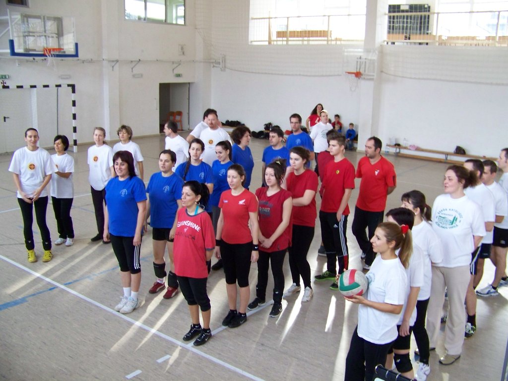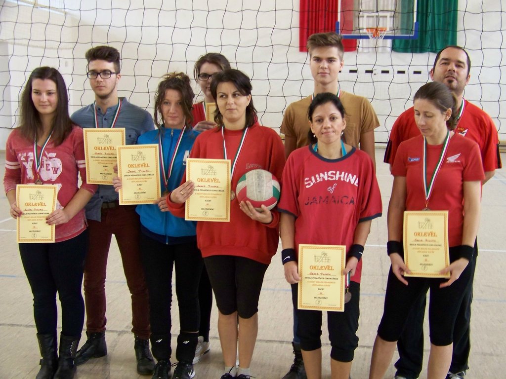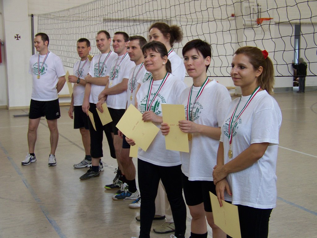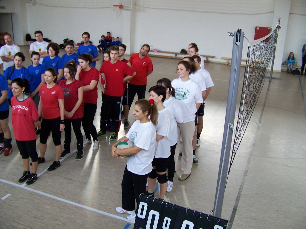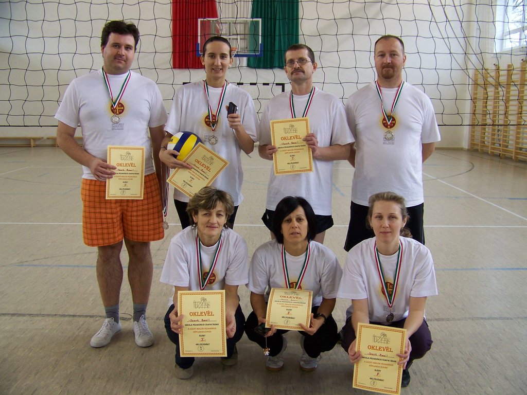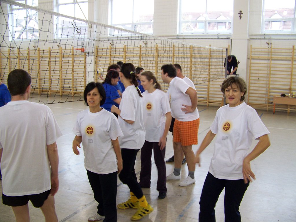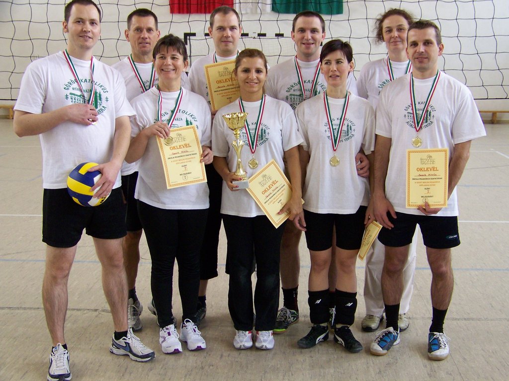 Azonban e szombat délelőtti napon a tornaterem „dekorációját” csupán egy kifeszített röplabdaháló jelentette, hisz’ csak ennyi kell a röplabda nevezetű játékhoz… no meg persze lelkes pedagógus-csapatok, abból pedig nem volt hiány. És láss csodát, a pedagógusok az élet más területein is - így a sportban, a röplabdában is - tudnak kiemelkedőt nyújtani. A résztvevő négy egyházmegyei iskola női és férfi pedagógusaiból álló vegyes csapatai körmérkőzéseket játszottak. A hangos és kitartó szurkolásnak pedig óriási „varázsereje” volt; megmutatta, hogy az esetleges kezdeti görcsösség hamar elmúlik, s akár a végső győzelemig is képes elrepíteni egy csapatot.