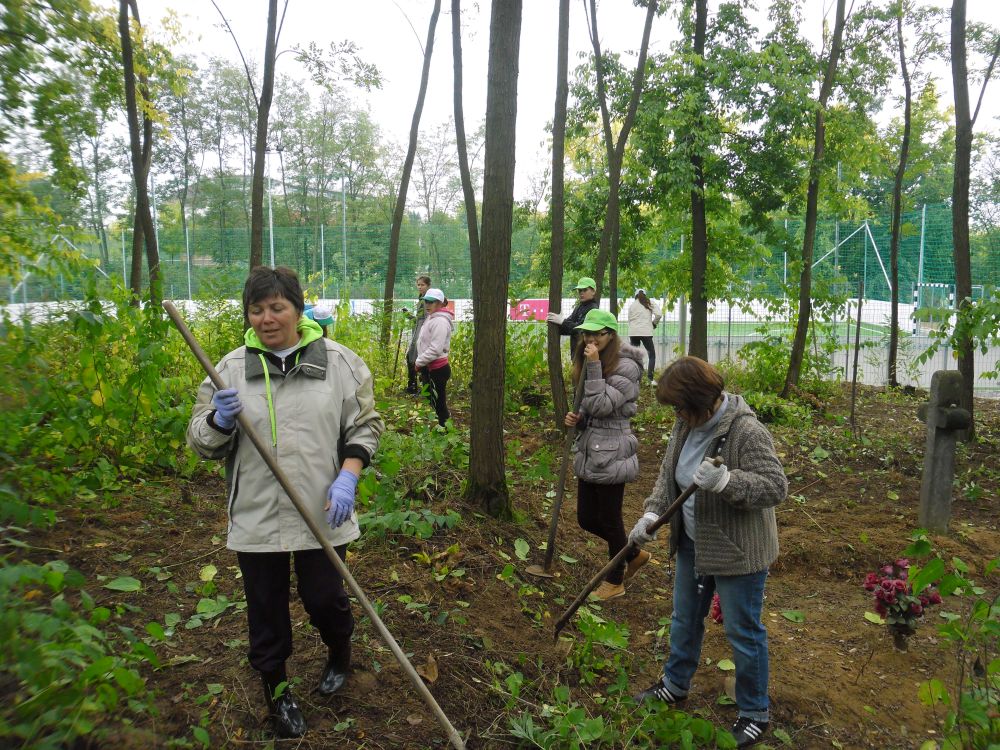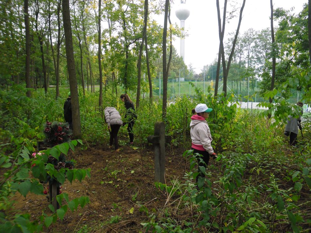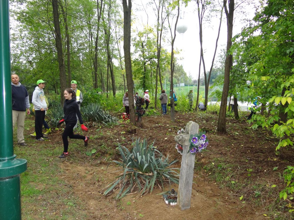 - A harmadik feladatunk olyan területnek a megtisztítása volt a gaztól, amelyik már nem működik temetőként, de még mindig vannak ott sírok és fejfák, így ennek a résznek a megnevezése lehet, a „temető gondozás”. Felszámolt temetőről van szó, az önkormányzat által készített kis emlékmű jelzi, hogy ez a terület temető volt. Az emlékmű mellett lévő terület rendbetételét kezdtük el. Sajnos, azt nem tudtuk elkerülni, hogy sírokon is átmenjünk, de a gaz kikapálása, összegereblyézése és elhordása másként nem volt megoldható. A munka közbeni beszélgetéskor erre is kitért a dolgozó ifjúság, hogy nem sértjük-e így a kegyeletet.
