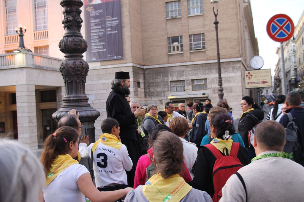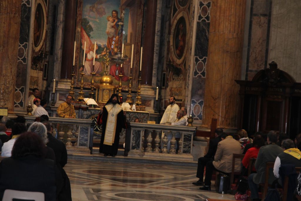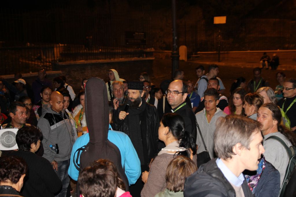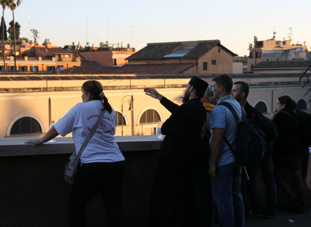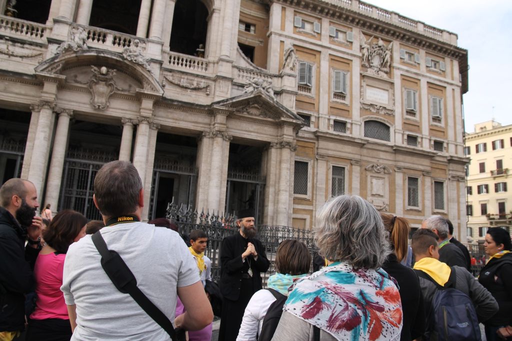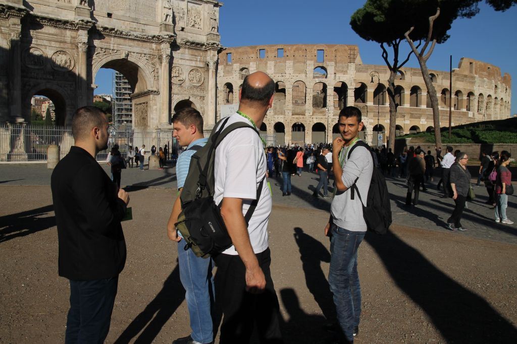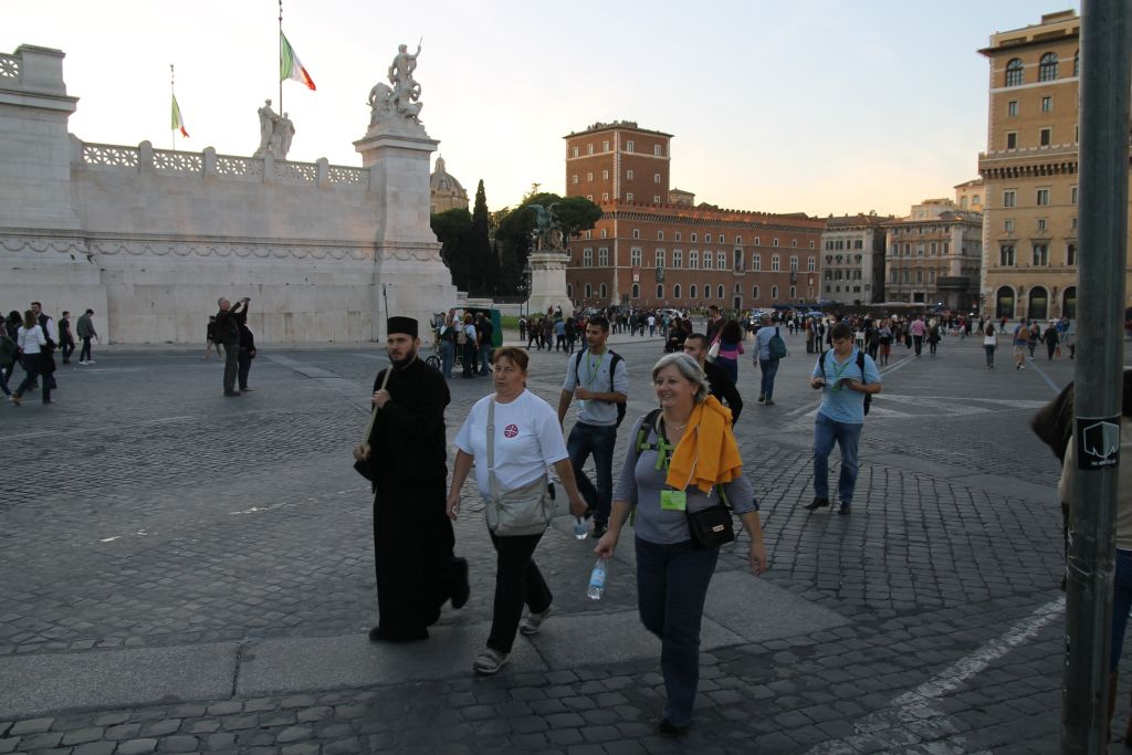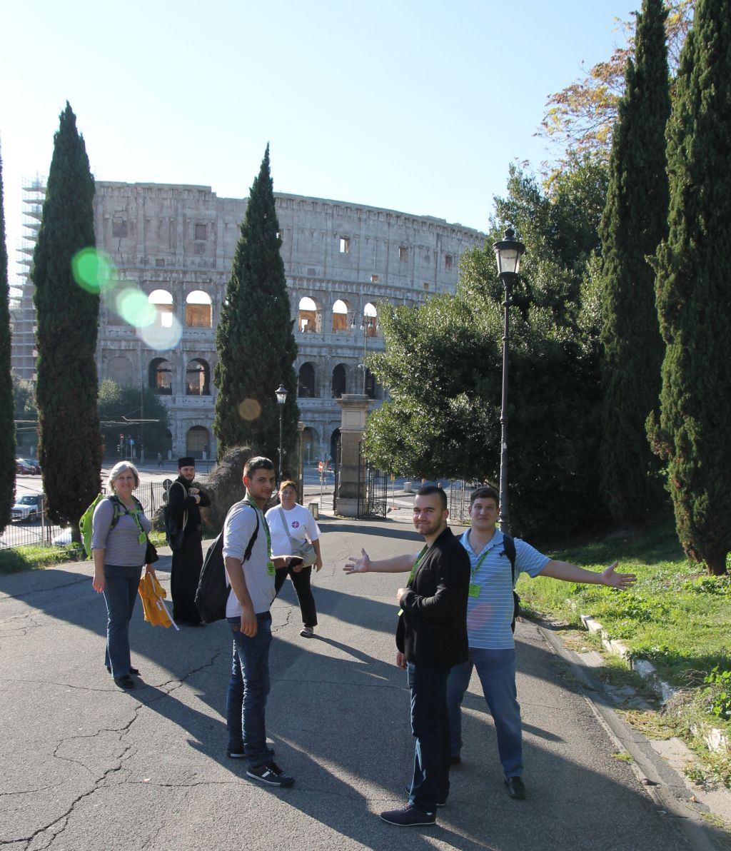 Rómába szombat reggel tíz órára értünk, ami után egész napos városnézés követett. Elsőként a San Callisto katakombákat csodálhattuk meg. A katakomba a korai keresztények földalatti temetkezési és istentiszteleti helye volt a keresztényüldözések korában. A San Callistóban magyar nyelvű magnófelvétellel vezettek körbe minket. De vajon miért minek ereszkedjünk a föld alá, amikor a római napsütésben annyi szépet látni? Azért, mivel itt a forróság elől árnyékra és a felszíninél is csodálatosabb ókorra találunk. A katakombák után megcsodálhattuk a derűs római napfénybe a Lateráni bazilikát is. A Lateráni bazilikáról annyit érdemes tudni, hogy a Rómába található négy nagy bazilika közül a legfontosabb mivel itt található a pápai trón. „Minden templom anyja és feje”, az ökumenikus anyaegyház (azaz a teljes lakott világ anyaegyháza) cím birtokosa. Itt Székely János püspök vezetésével közös imán is részt vehettek testvéreink. A Lateráni bazilika után a Colosseumhoz, Róma egyik meghatározó szimbólumához sétáltunk. Majd Szócska Ábel atya vezetésével érdekes helyeket kerestünk fel. Az este folyamán, a nap lezárásaként következett zarándokutunk egyik fontos eseménye, a keresztút. A keresztút olyan ájtatosság, amelynek segítségével a keresztény hívek Jézus szenvedésein és keresztre feszítésének eseményein elmélkedhetnek. Számos nemzet zászlói alatt vonuló cigány testvéreink felváltva adták meg a tisztelet Jézus Krisztusnak. Sajnos Fülöp metropolita a keresztút végére tudott meglátogatni minket, de szokásához híven jó kedvet varázsolt a megfáradt zarándokok szívébe. Valamint megígérte, hogy másnap ő maga személyesen fog körbevezetni Rómában.