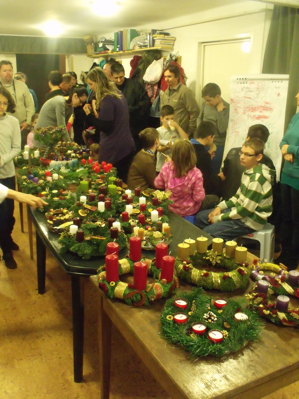 November 15-én, vasárnap délután összegyűltek a tócóskerti görögkatolikus családok, hogy egymás körében elkészítsék 6 gyertyás koszorúikat. A baráti beszélgetések közepette mindenkit áthatott az alkotás öröme. A fenyőágak, fahéj rudak és ánizscsillagok illatán túl a gyerekek nagy örömére a helyben készült (kb. 200 db) palacsinta illata is belepte a parókiát. A koszorúk elkészültével János atya megáldotta a szebbnél szebb alkotásokat, majd az első gyertya meggyújtása következett. Ezután minden vasárnap egy újabb gyertya fényével erősödik szívünkben a várakozás.