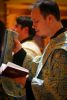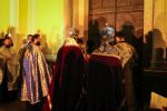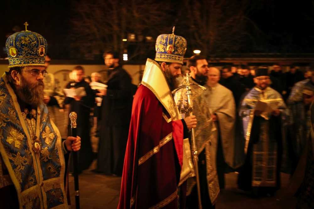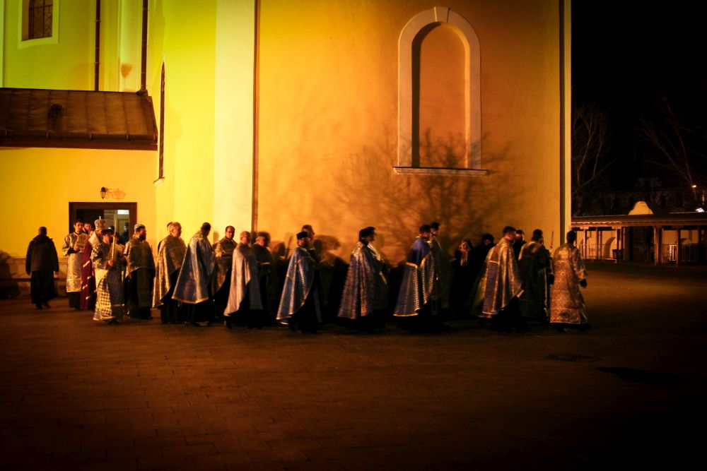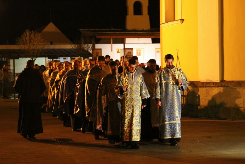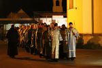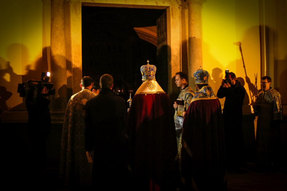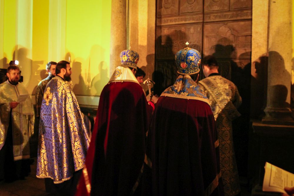 A menet a Kegytemplom ajtaja előtt megállt, ahol a három egyházmegye vezetői egy sajátos bizánci szertartás keretében - amely a templomszentelés szertartásának is szerves része - nyitották meg a kapukat. A hívek a Sokirgalmú (135. zsoltár) közös éneklésével vonultak be a templomba, s majd ez után folytódott a vecsernye szokásos szertartása a királyi ajtónál a "bemenet" rendjével.
