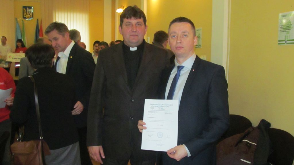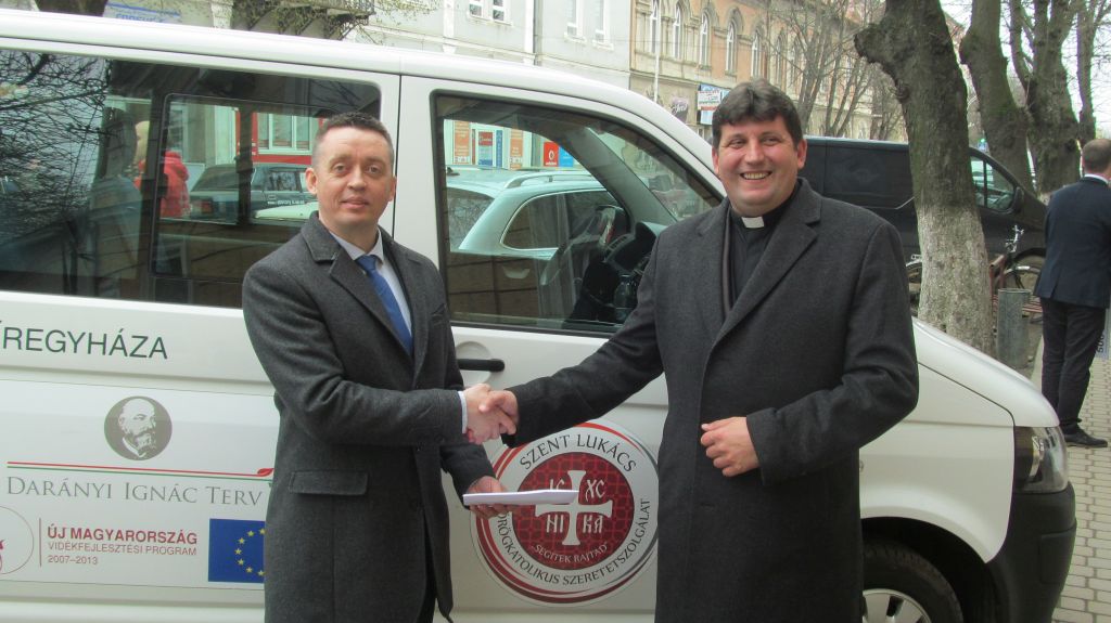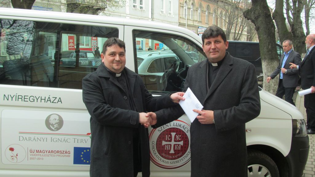 Az adományt Harangozó Miklós, a Szent Pantaleimon Karitász igazgatója vette át Ungvári Sándortól, a Szent Lukács Görögkatolikus Szeretetszolgálat igazgatójától és Ősz Tibor atyától, a Szeretetszolgálat lelki igazgatójától.