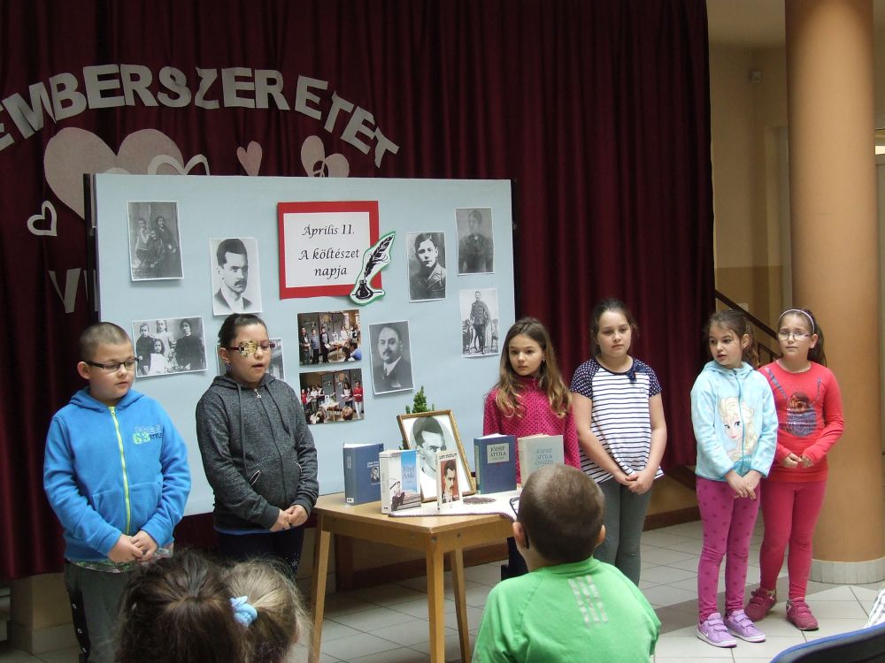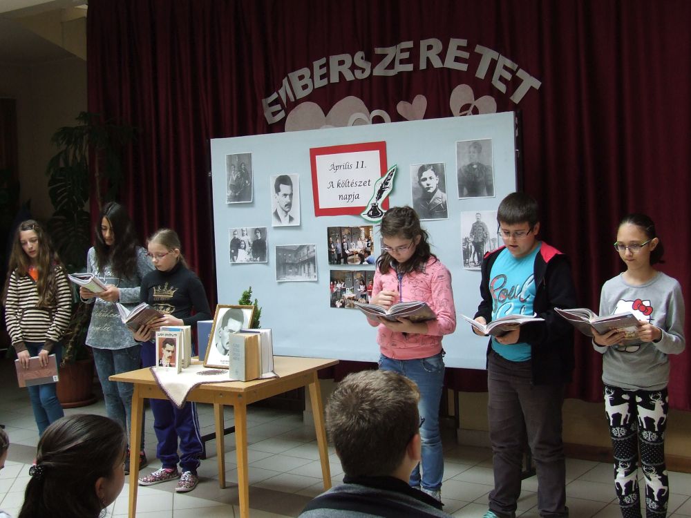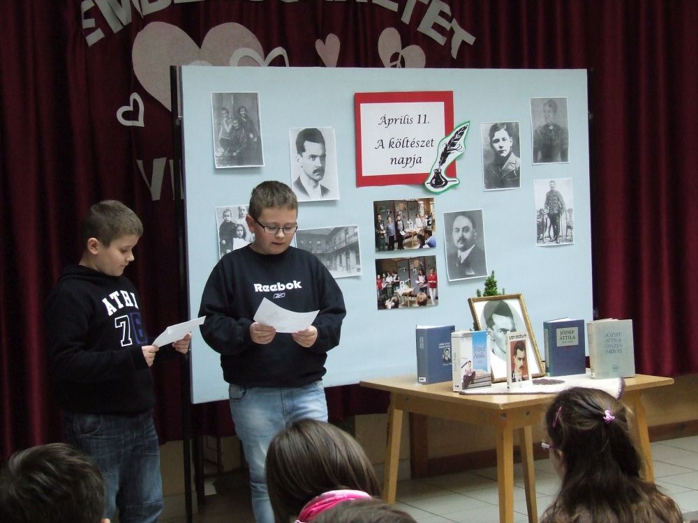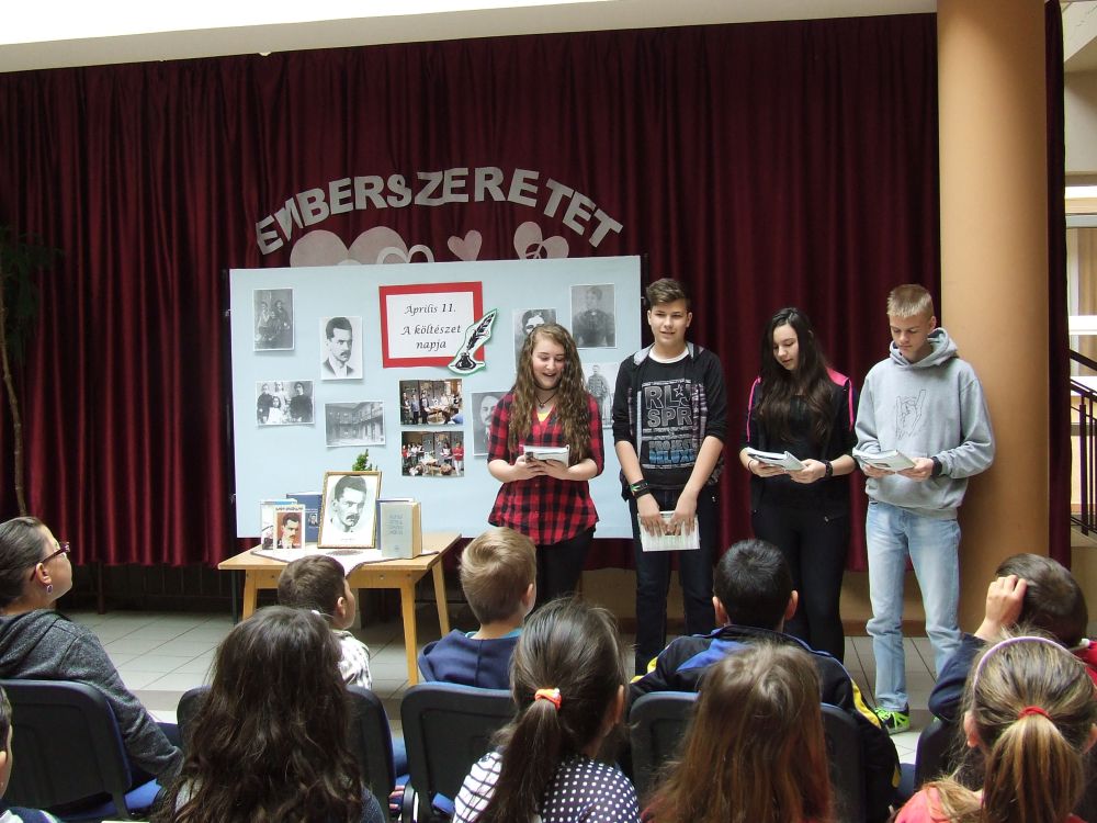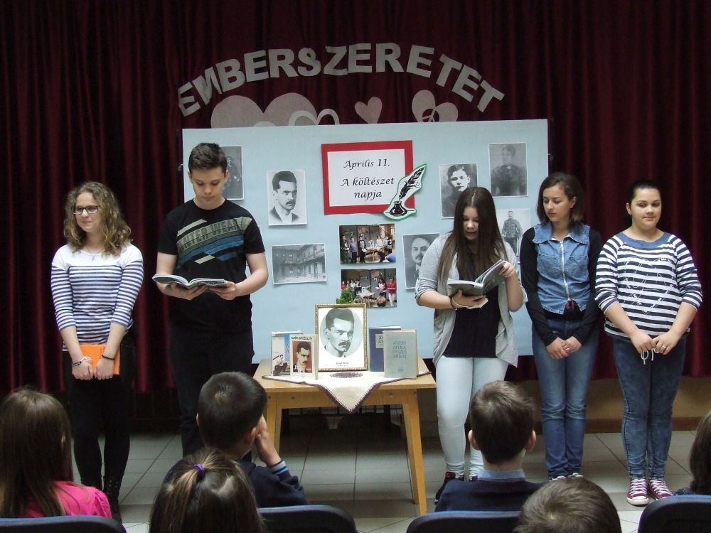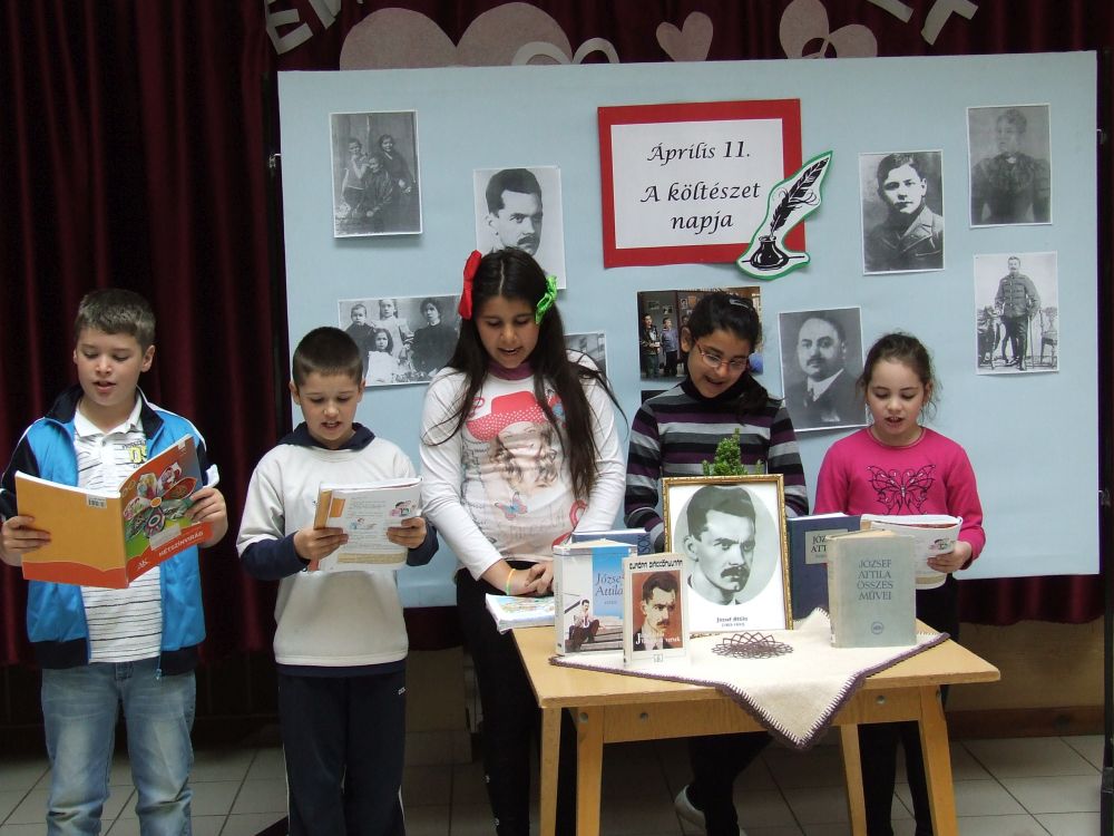 A 14 éves múltra visszatekintő rendezvény idén rendhagyó módon kezdődött. Az aulában kezdtük a napot, ahol a megnyitót követően 330 diák közösen szavalta József Attila Születésnapomra című versét. Ezt követően elindítottuk a „versfolyamot”, ami egész délelőtt hömpölygött az iskola aulájában. Az osztályok, diákcsoportok folyamatosan váltották egymást, s szólaltattak meg egy híján száz magyar verset. A sort a harmadik évfolyam tanulói zárták, akik olyan lelkesek voltak, hogy 45 perc alatt harminc verset olvastak vagy mondtak el. A versolvasó délelőttön hallgatóként vagy szereplőként az iskola minden diákja részt vett, a pedagógusok közül Simonné Czentye Anikó, Tulipán Tamásné és Kedves Györgyné Zilahi Enikő is megajándékozta a gyerekeket egy-egy szép magyar verssel.