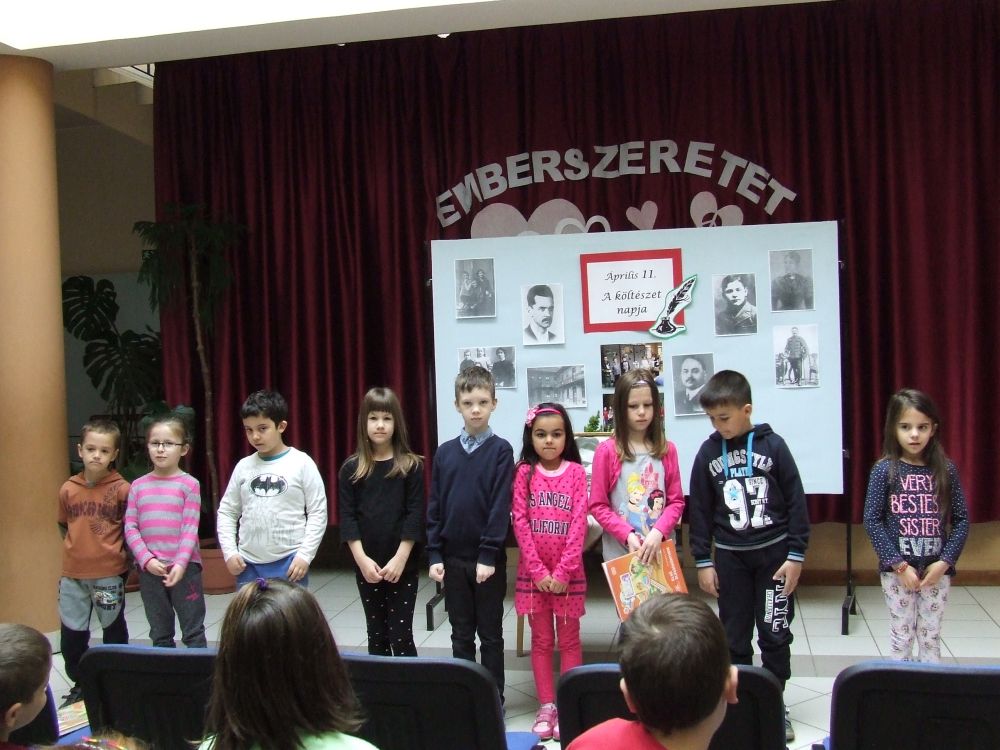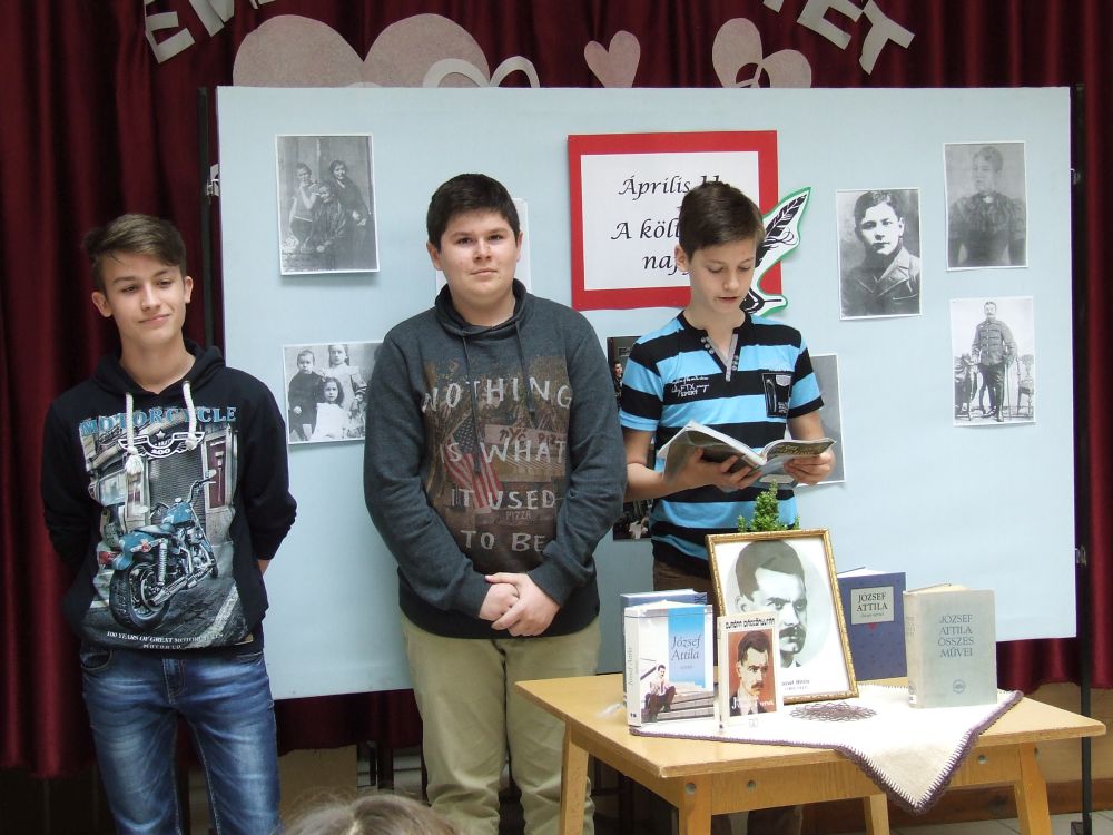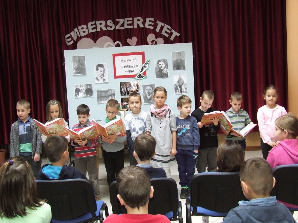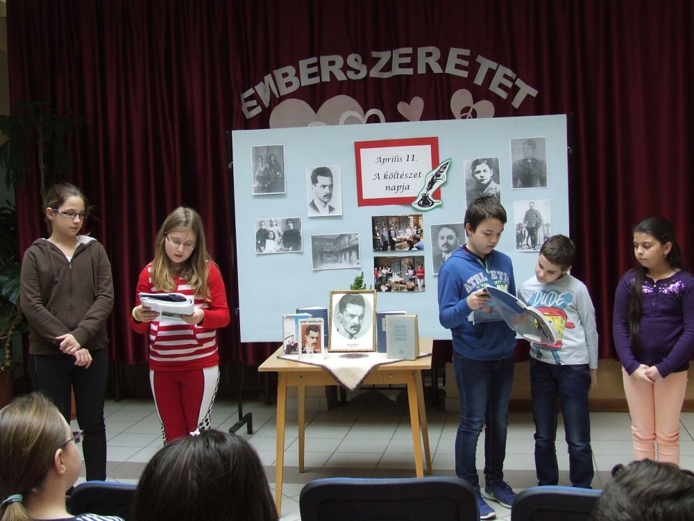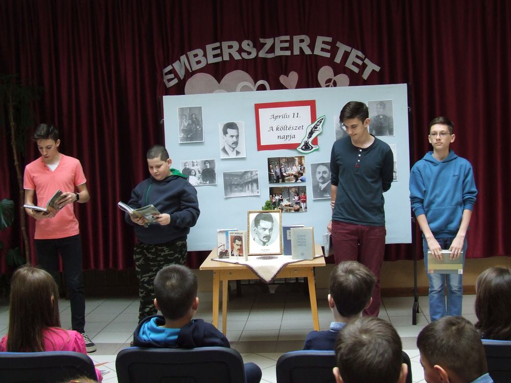 A 14 éves múltra visszatekintő rendezvény idén rendhagyó módon kezdődött. Az aulában kezdtük a napot, ahol a megnyitót követően 330 diák közösen szavalta József Attila Születésnapomra című versét. Ezt követően elindítottuk a „versfolyamot”, ami egész délelőtt hömpölygött az iskola aulájában. Az osztályok, diákcsoportok folyamatosan váltották egymást, s szólaltattak meg egy híján száz magyar verset. A sort a harmadik évfolyam tanulói zárták, akik olyan lelkesek voltak, hogy 45 perc alatt harminc verset olvastak vagy mondtak el. A versolvasó délelőttön hallgatóként vagy szereplőként az iskola minden diákja részt vett, a pedagógusok közül Simonné Czentye Anikó, Tulipán Tamásné és Kedves Györgyné Zilahi Enikő is megajándékozta a gyerekeket egy-egy szép magyar verssel.