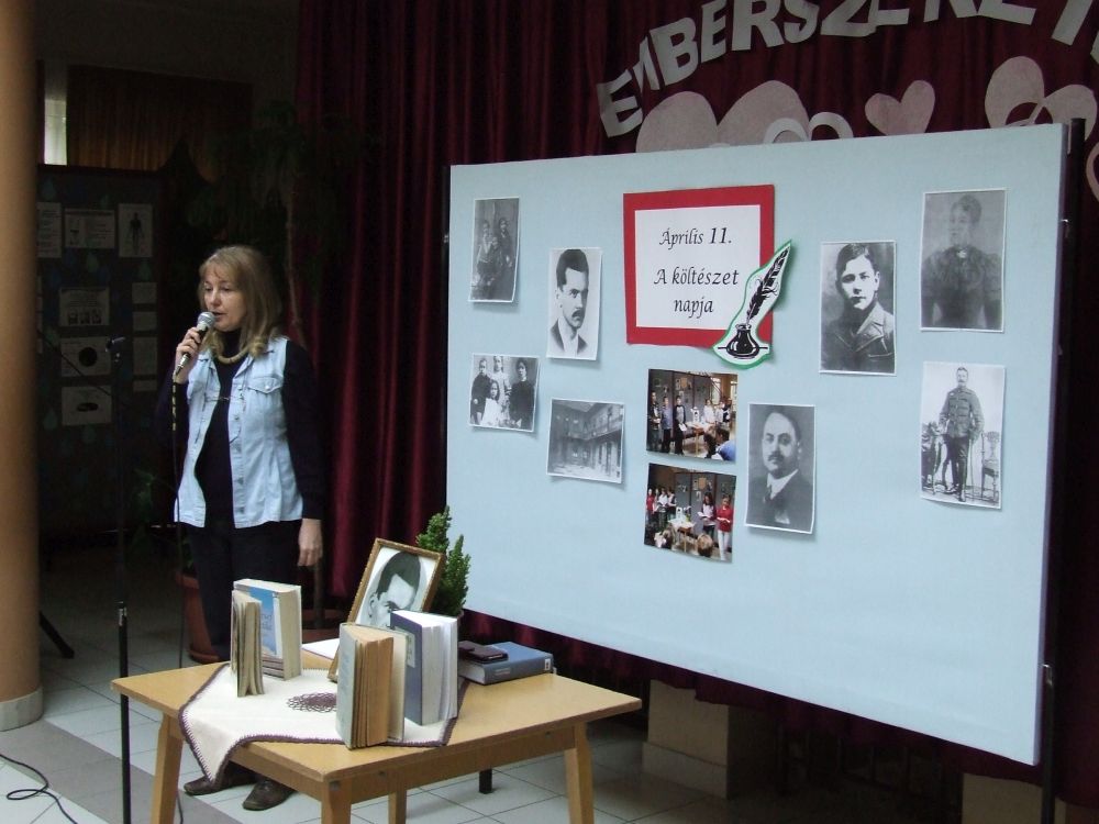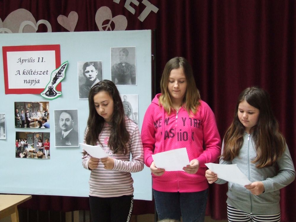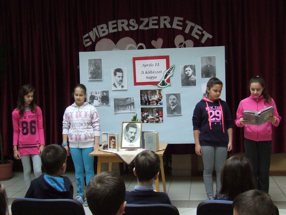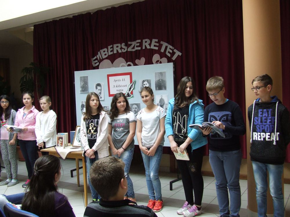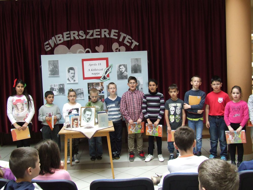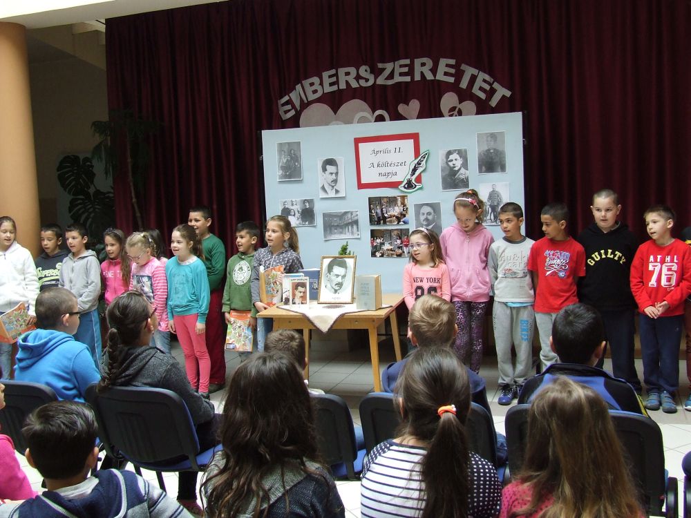 A 14 éves múltra visszatekintő rendezvény idén rendhagyó módon kezdődött. Az aulában kezdtük a napot, ahol a megnyitót követően 330 diák közösen szavalta József Attila Születésnapomra című versét. Ezt követően elindítottuk a „versfolyamot”, ami egész délelőtt hömpölygött az iskola aulájában. Az osztályok, diákcsoportok folyamatosan váltották egymást, s szólaltattak meg egy híján száz magyar verset. A sort a harmadik évfolyam tanulói zárták, akik olyan lelkesek voltak, hogy 45 perc alatt harminc verset olvastak vagy mondtak el. A versolvasó délelőttön hallgatóként vagy szereplőként az iskola minden diákja részt vett, a pedagógusok közül Simonné Czentye Anikó, Tulipán Tamásné és Kedves Györgyné Zilahi Enikő is megajándékozta a gyerekeket egy-egy szép magyar verssel.