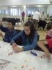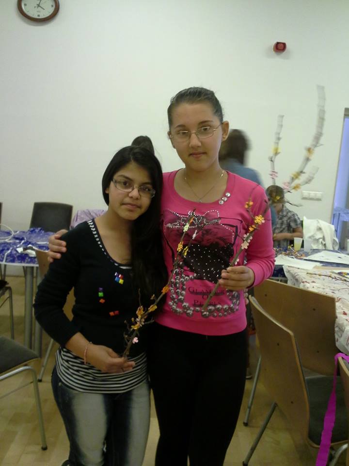 Ezután virágzó tavaszi fát kezdtünk készíteni, amihez különböző színű papírvirágok álltak a rendelkezésünkre, felragasztásukhoz pedig ragasztópisztolyt használtunk.