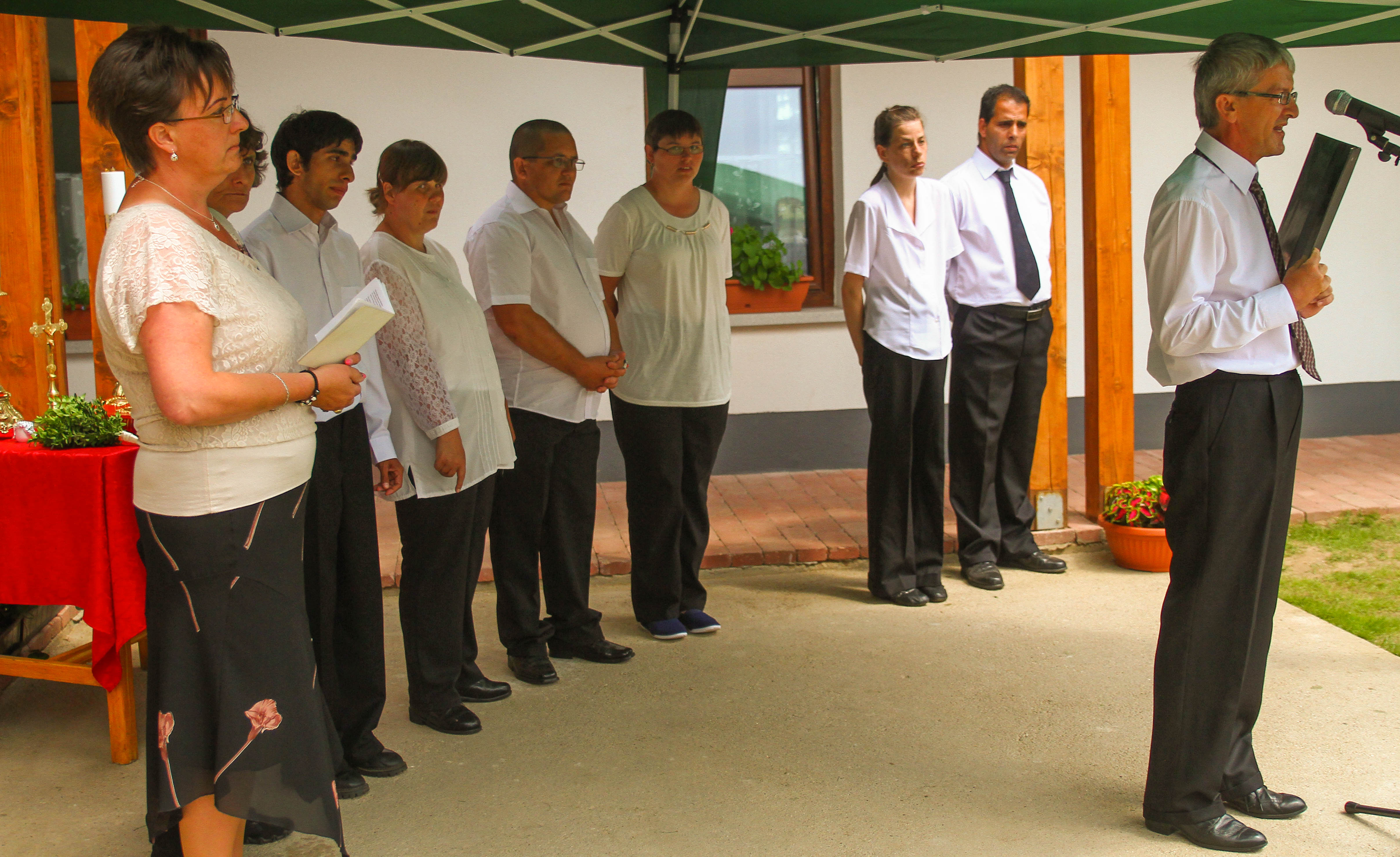 Az otthonról: a projekt a TIOP – 3.4.1. A-11/1-2012-0003 „A szakolyi Szent Lukács Görögkatolikus Szeretetszolgálat Ápoló – Gondozó Otthonának kiváltása” keretében valósult meg. A projekt, egyben a fenti kitagolás eredményeként 1 db 18 fős lakóház, 6 db 6 fős lakás, 8 db 10 fős lakás, 1 db 20 fős lakás energiatakarékos létesítése valósult meg a Stratégiával összhangban megfogalmazottak szerint a kapcsolódó szociális szolgáltatások fejlesztése mellett. A fejlesztés eredményeként az ellátottak és az érintett célcsoportok életszínvonala, a számukra nyújtott szolgáltatások minősége javult. A Szent Lukács Görögkatolikus Szeretetszolgálat Ápoló – Gondozó Otthonában 130 fő fogyatékos személyek ápoló – gondozó otthoni és 2 x 10 fő ápoló – gondozó célú lakóotthoni ellátását látták el április 14-ig. 2016. április 15-én kapta meg az Intézmény a jogerős működési engedélyét, ettől kezdve megszűnt az ápoló – gondozó otthoni és ápoló – gondozó célú lakóotthoni tevékenység, felváltotta a támogatott lakhatást biztosító ellátás. A lakók beköltöztek a lakásaikba. Ennek zárása volt a mostani házszentelő ünnepség. A Szent Lukács Görögkatolikus Integrált Szolgáltató Központ a szociális törvény szerinti szakosított ellátási formát nyújtó és speciális alapellátási feladatokat biztosító szolgáltató intézmény, mely elő kívánja segíteni a fogyatékos személyek integrációját, helyi szinten – a jelenlegi ellátórendszerekkel együttműködve – támogatni a fogyatékossággal élő embereket abban, hogy lehetőségeikhez képest önálló és független életet élhessenek. Az önálló életvitel elengedhetetlen része a foglalkoztatás biztosítása, így valósítják meg a komplex ellátást. Ennek érdekében a székhelyen támogatott lakhatást és annak szolgáltatási elemeit (étkeztetés, ápolás – gondozás, fejlesztés, társadalmi életben való részvételt segítő szolgáltatás) kívánják biztosítani 150 enyhe és középsúlyos értelmi fogyatékos személy részére. Az Integrált Szolgáltató Központ Támogató Szolgáltatás biztosításával 4 járás településein biztosítják a személyi segítést, személyi szállítást és a hozzá kapcsolódó kísérést. A szolgáltató szociális foglalkoztatás – fejlesztő felkészítő és munka rehabilitációs - biztosításával az alábbi foglalkoztatási formákat biztosítja: gyertyaöntő és kerámia műhely, textil termékek készítése, pék és száraztészta foglalkoztató, kertészeti tevékenység (parkgondozás, növénytermesztés). Külső foglalkoztatás keretében szőnyegszövést végezhetnek még a lakók. A Szolgáltató telephelyén – Nyírkarász – 31 fő részére idősek otthonát működtet.