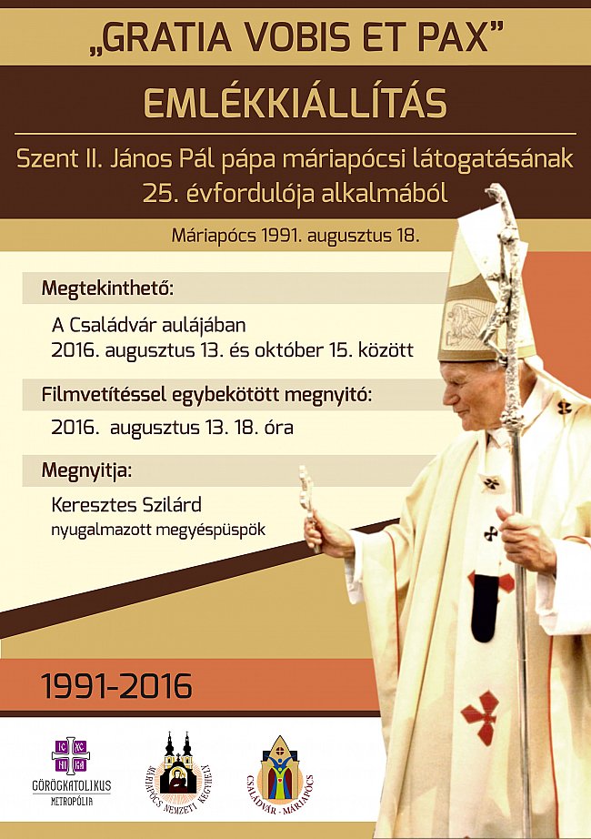 Gratia vobis et pax - ezzel a címmel rendeznek emlékkiállítást Szent II. János Pál pápa máriapócsi látogatásának 25. évfordulója alkalmából. A tárlat ünnepélyes megnyitója a Családvár aulájában lesz 2016. augusztus 13-án, 18 órától. A kiállítás október 15-ig tekinthető meg.
