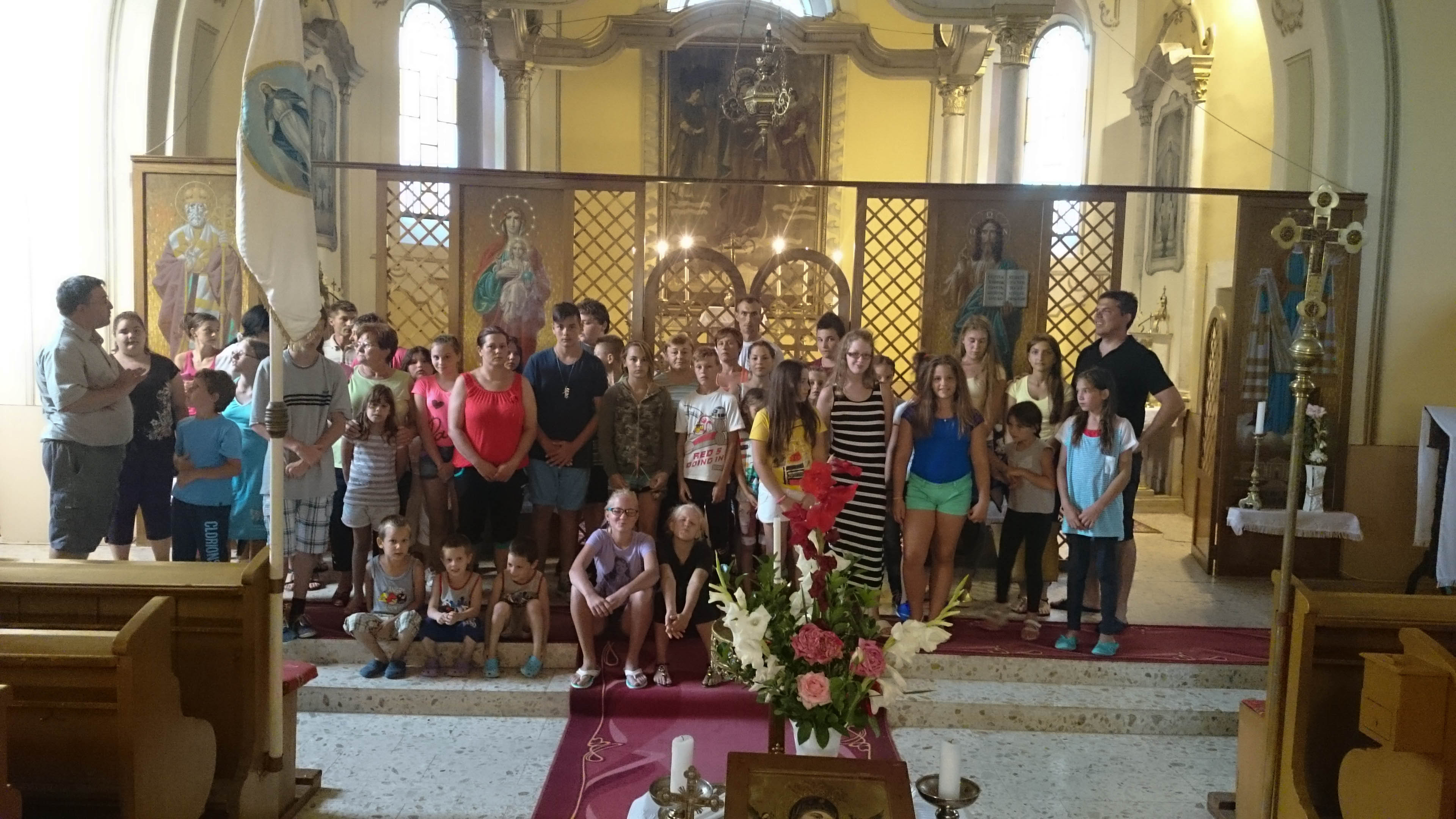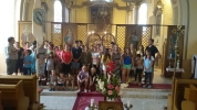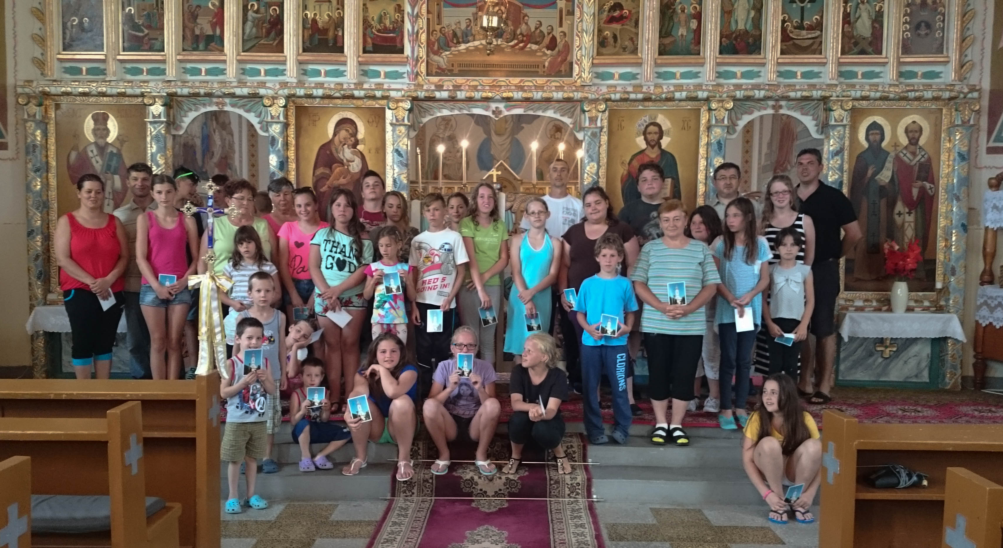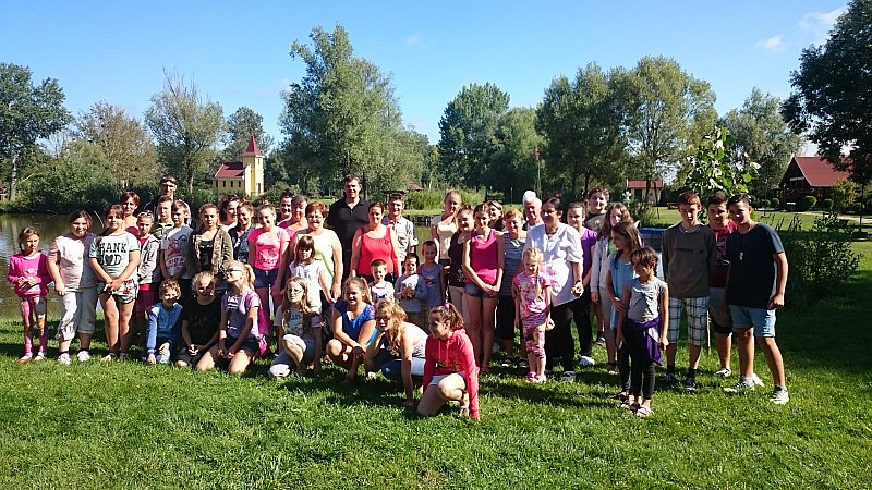 2016. július 20-án az álmosdi, bagaméri és kokadi hittanos gyermekek kísérőikkel együtt, összesen 55-en, egynapos hittantáborban vettünk részt a Dózer Horgásztó és Termál Szabadidőparkban Penészleken, Jaczkó Dániel atya vezetésével. A tábor éppen Illés próféta napjára esett, ezért az atya a programokat igyekezett Illés próféta történetei köré felépíteni. Az odautazás során a buszon elvégeztük a reggeli imákat, jókat énekeltünk, majd Dániel atya történeteket mondott és olvasott fel a jeles próféta életéből előre jelezvén a gyermekeknek, hogy a nap folyamán a vetélkedőkön szükségesek lesznek az elhangzott információk. A Dózer tanyára megérkezve a tulajdonos egy különálló nagy filagóriát ajánlott fel számunkra, ahol elhelyezhettük csomagjainkat, majd később hűsölhettünk. Ezután játékos versenyek, vetélkedők következtek. Emellett horgászásra, csónakázásra, vízi biciklizésre is volt lehetőségünk. A kellemes nyári időben fürdőzhettek, csúszdázhattak, labdázhattak a hittanosok egészen az ebéd elkészültéig. A finom ebédet a szabadidő központ ebédlőjében fogyasztottuk el, majd egy kis ejtőzés után folytatódott a szabad strandolás a kísérő felnőttek felügyelete mellett. Hazafelé jövet még megnéztünk két templomot. Csingi Zoltán atya várt bennünket Penészleken, hogy bemutassa az érdekességekben gazdag, Közép-Európa legnagyobb görögkatolikus templomát, melyet a ruszin származású lakosság jórészt saját erőből épített fel. Érdekfeszítő előadást hallhattunk a templom hatalmas tornyáról, négy harangjáról, altemplomáról, valamint a feltárt és feltárás előtt álló alagút-rendszeréről. Zoltán atya beszélt a penészleki hívek önzetlen adakozó készségéről, melynek eredményeként bemutatta a megújult ajtókat, és beszélt az ikonosztáz képeit megfestő művészről is. Ezután Fülöpön a torony nélküli templomot néztük meg. Itt a templom építésének izgalmas történelmi körülményeit osztotta meg velünk Zoli atya. A fülöpi templomlátogatást közös éneklés zárta, majd egy helyi vállalkozó friss, lehűtött, nagyon ízletes dinnyével vendégelt meg bennünket. Rendkívül jól esett mindenkinek. Ezúton is köszönjük.
