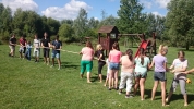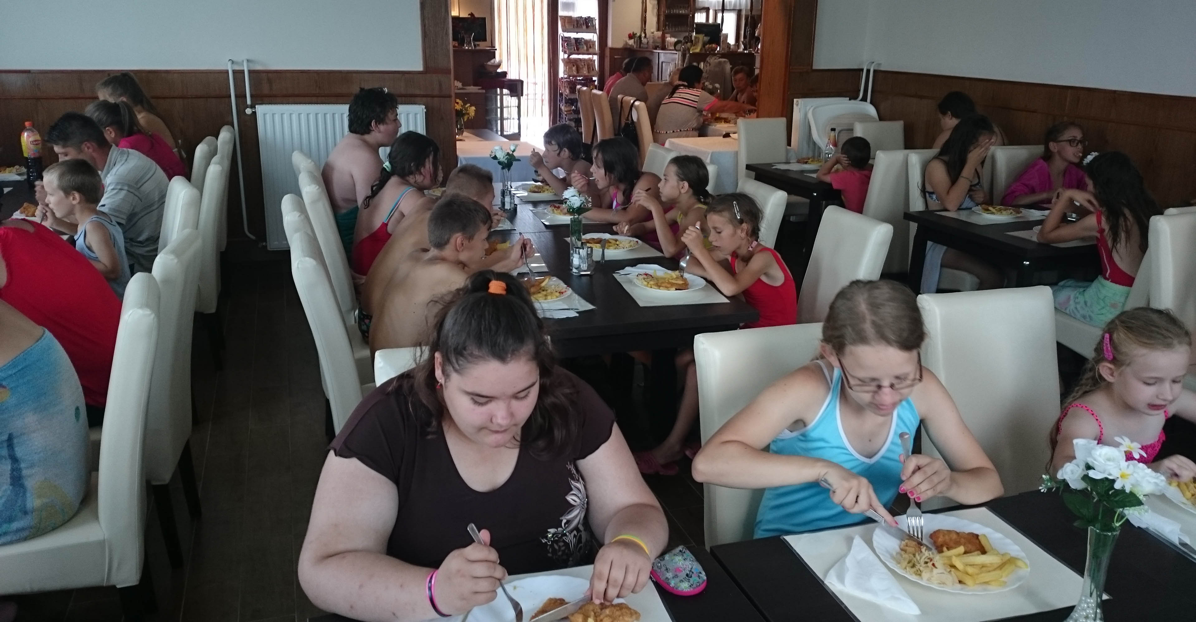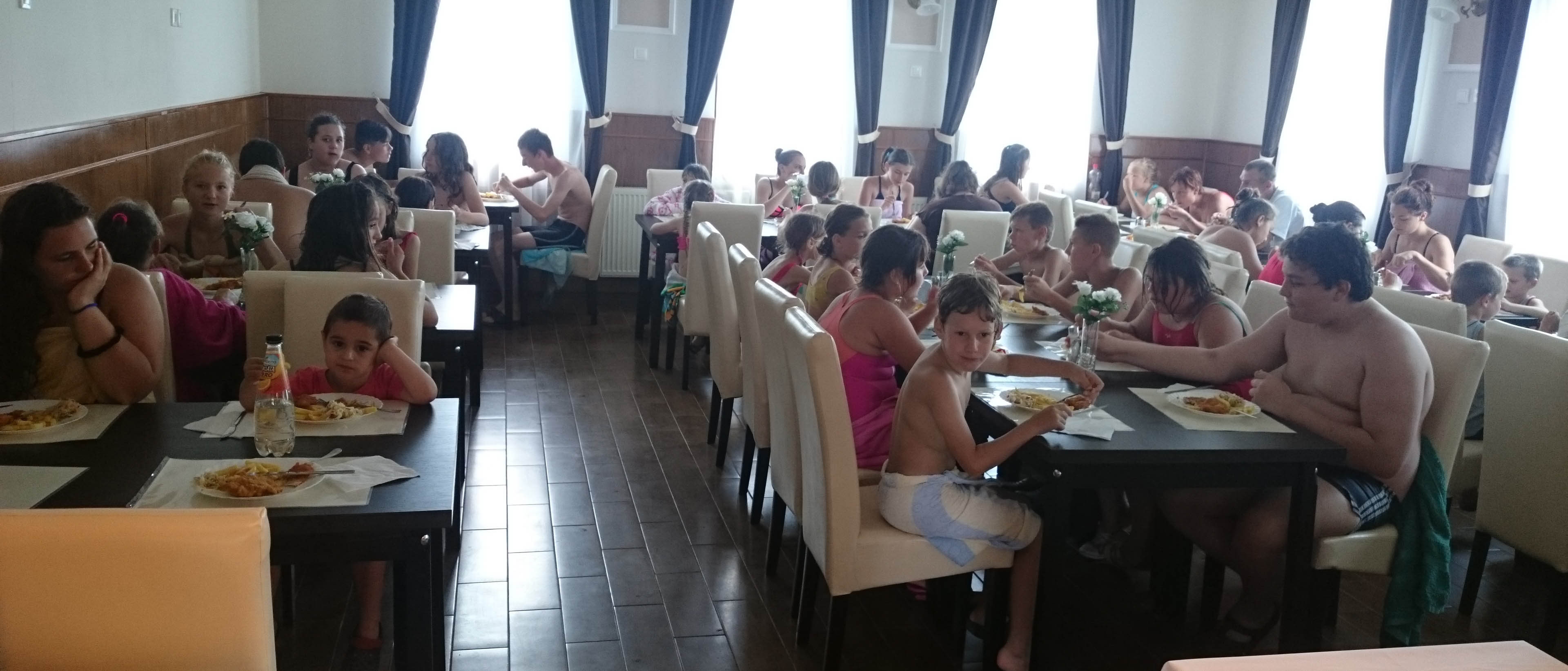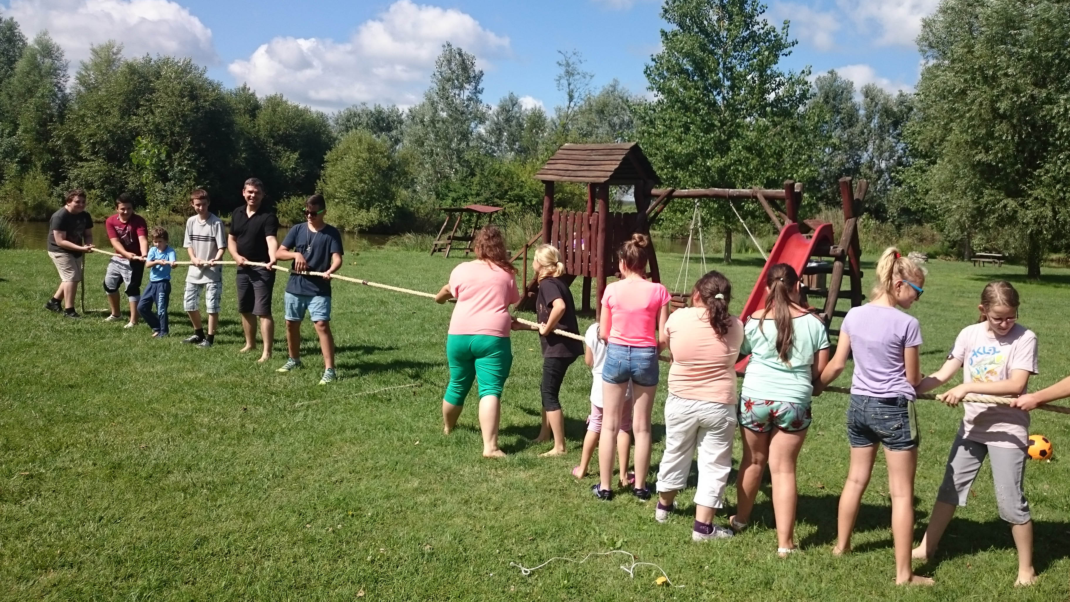 2016. július 20-án az álmosdi, bagaméri és kokadi hittanos gyermekek kísérőikkel együtt, összesen 55-en, egynapos hittantáborban vettünk részt a Dózer Horgásztó és Termál Szabadidőparkban Penészleken, Jaczkó Dániel atya vezetésével. A tábor éppen Illés próféta napjára esett, ezért az atya a programokat igyekezett Illés próféta történetei köré felépíteni. Az odautazás során a buszon elvégeztük a reggeli imákat, jókat énekeltünk, majd Dániel atya történeteket mondott és olvasott fel a jeles próféta életéből előre jelezvén a gyermekeknek, hogy a nap folyamán a vetélkedőkön szükségesek lesznek az elhangzott információk. A Dózer tanyára megérkezve a tulajdonos egy különálló nagy filagóriát ajánlott fel számunkra, ahol elhelyezhettük csomagjainkat, majd később hűsölhettünk. Ezután játékos versenyek, vetélkedők következtek. Emellett horgászásra, csónakázásra, vízi biciklizésre is volt lehetőségünk. A kellemes nyári időben fürdőzhettek, csúszdázhattak, labdázhattak a hittanosok egészen az ebéd elkészültéig. A finom ebédet a szabadidő központ ebédlőjében fogyasztottuk el, majd egy kis ejtőzés után folytatódott a szabad strandolás a kísérő felnőttek felügyelete mellett. Hazafelé jövet még megnéztünk két templomot. Csingi Zoltán atya várt bennünket Penészleken, hogy bemutassa az érdekességekben gazdag, Közép-Európa legnagyobb görögkatolikus templomát, melyet a ruszin származású lakosság jórészt saját erőből épített fel. Érdekfeszítő előadást hallhattunk a templom hatalmas tornyáról, négy harangjáról, altemplomáról, valamint a feltárt és feltárás előtt álló alagút-rendszeréről. Zoltán atya beszélt a penészleki hívek önzetlen adakozó készségéről, melynek eredményeként bemutatta a megújult ajtókat, és beszélt az ikonosztáz képeit megfestő művészről is. Ezután Fülöpön a torony nélküli templomot néztük meg. Itt a templom építésének izgalmas történelmi körülményeit osztotta meg velünk Zoli atya. A fülöpi templomlátogatást közös éneklés zárta, majd egy helyi vállalkozó friss, lehűtött, nagyon ízletes dinnyével vendégelt meg bennünket. Rendkívül jól esett mindenkinek. Ezúton is köszönjük.