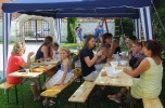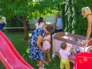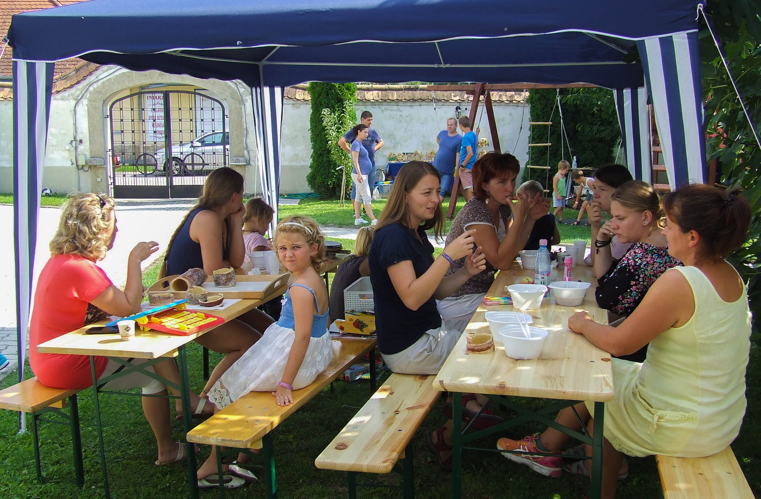 Közös imával, majd bemutatkozással indult a nap. Mindenki elmondta azt is, hogy mivel tud segítségére lenni másoknak. A bemutatkozást színes programok követtek: gyöngyfűzés, szalma- és csuhébábok készítése, kürtőskalács sütés, játszóház, csocsó, ping-pong, tollaslabda és íjászkodás. Miközben citera kísérettel népdalokat énekeltünk, bográcsban főtt az ebéd. A délutáni szórakozást bűvész trükkök bemutatója is fokozta. A Győri Egyházmegyei Karitász jóvoltából pedig minden gyerkőc 1-1 plüssjátékkal térhetett haza. A Győrben és környékén élő görögkatolikus híveknek azért is fontosak a hasonló alkalmak, mivel ilyenkor nyílik igazán lehetőség az egymás megismerésére, hiszen legtöbbször csak a vasárnapi liturgiákon látják egymást. Az egész napos közös élmény az egyházközséget jobban összekovácsolta, amellett, hogy már helyben érezhető volt új barátságok szövődése a zömmel hasonló korú kisgyerekekkel érkező családok és a társaság többi tagjai közt egyaránt. A résztvevők egybehangzó véleménye volt, hogy már nagyon várják a folytatást, szívesen szerveznének újabb családos együttléteket. Köszönet a kicsiny, de lelkes szervezőcsapatnak, hogy létrejöhetett ez az együttlét!