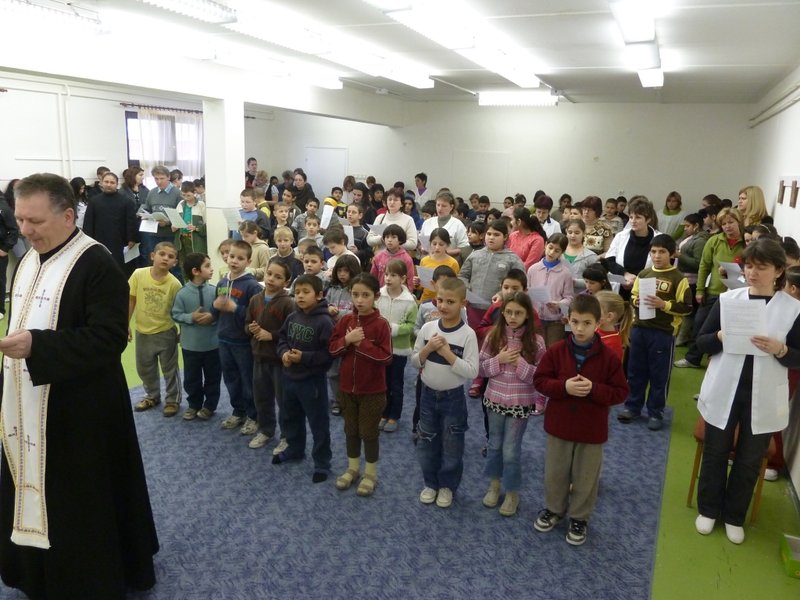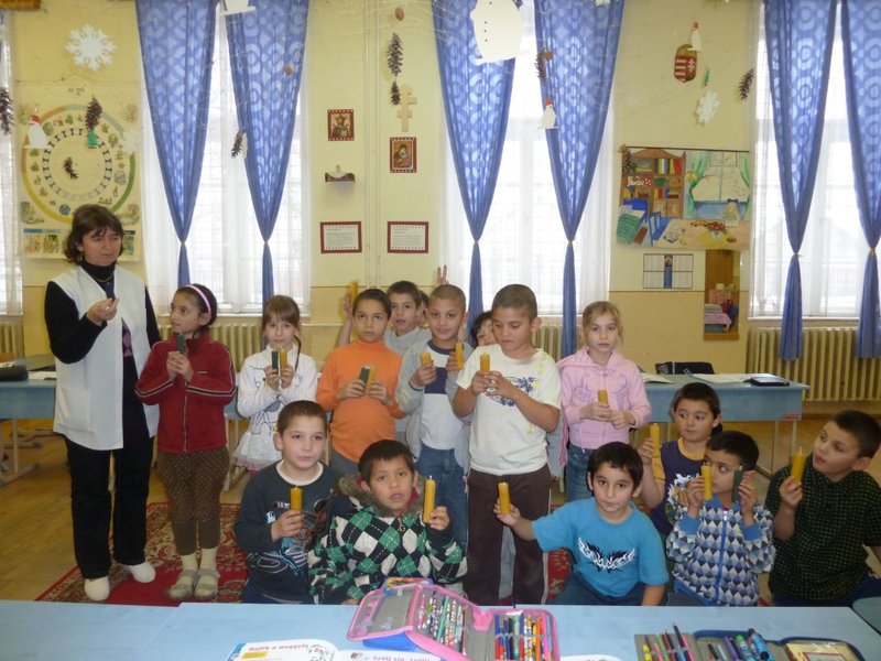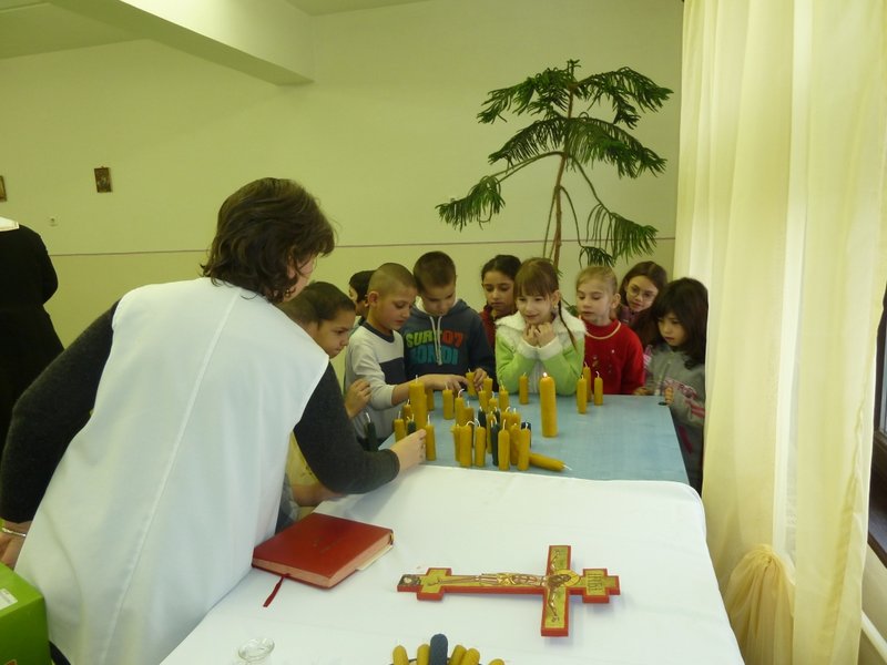 Az első osztály nagy izgalommal várta február 2-át. Előtte napon a gyertyakészítés volt a hittan óra legérdekesebb része. Nemcsak beszélgettünk a Gyertyaszentelő Boldogasszony ünnepéről, hanem az ünnep fényét emelve méhviaszból minden tanuló gyertyát készített. A készítés technikáját maga az iskolalelkész mutatta be, s a kicsiny gyerekkezek ügyesen utánozva formázták a gyertyákat. A tevékenykedés közben beszéltünk az öreg Simeonról, s elkezdtük megtanulni énekét: „Most bocsátod el Uram szolgádat…”.
