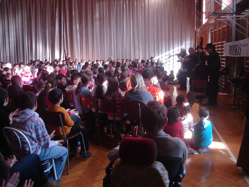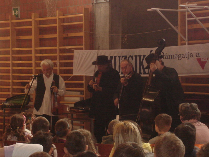 Sipos Mihály vezette az általános iskolai koncertet és tanította a gyerekeket csujogatni, és közösen megénekeltetett bennünket.