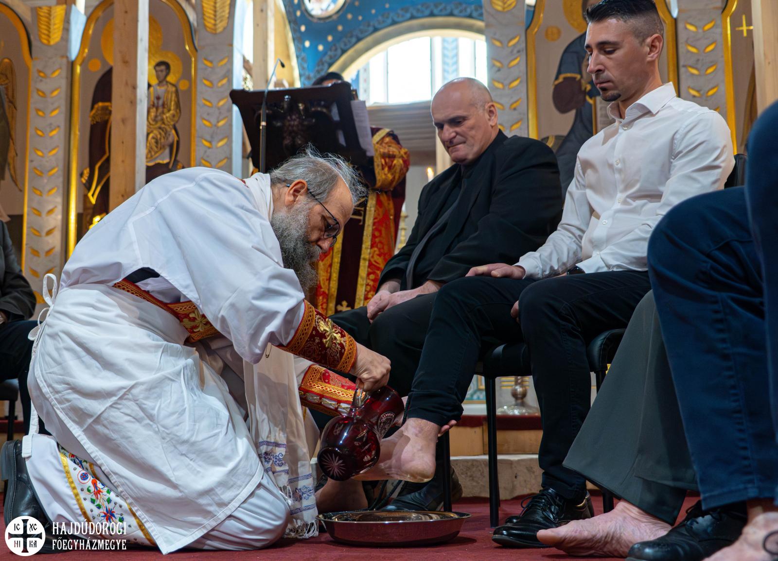 Az ünnepi liturgia végén Fülöp metropolita elvégezte a lábmosás szertartását is. Miközben Nyirán János fődiakónus az Evangélium erről szóló részét olvasta, Fülöp atya Krisztushoz hasonlóan levette felsőruháját, kendőt kötött magára, s kancsóval a kezében megmosta tizenkét férfi, egy parókus, egy papnövendék és a környező városi parókiák kiválasztott híveinek lábát. Az utolsó vacsorán Jézus végtelen szeretetét mutatta ki a lábmosással tanítványai felé, ugyanakkor példát is állított eléjük abban, milyen magatartással viseltessenek egymás iránt. Ezért is tekintünk rá a szolgálatkészség és a legteljesebb odaadás mintájaként.