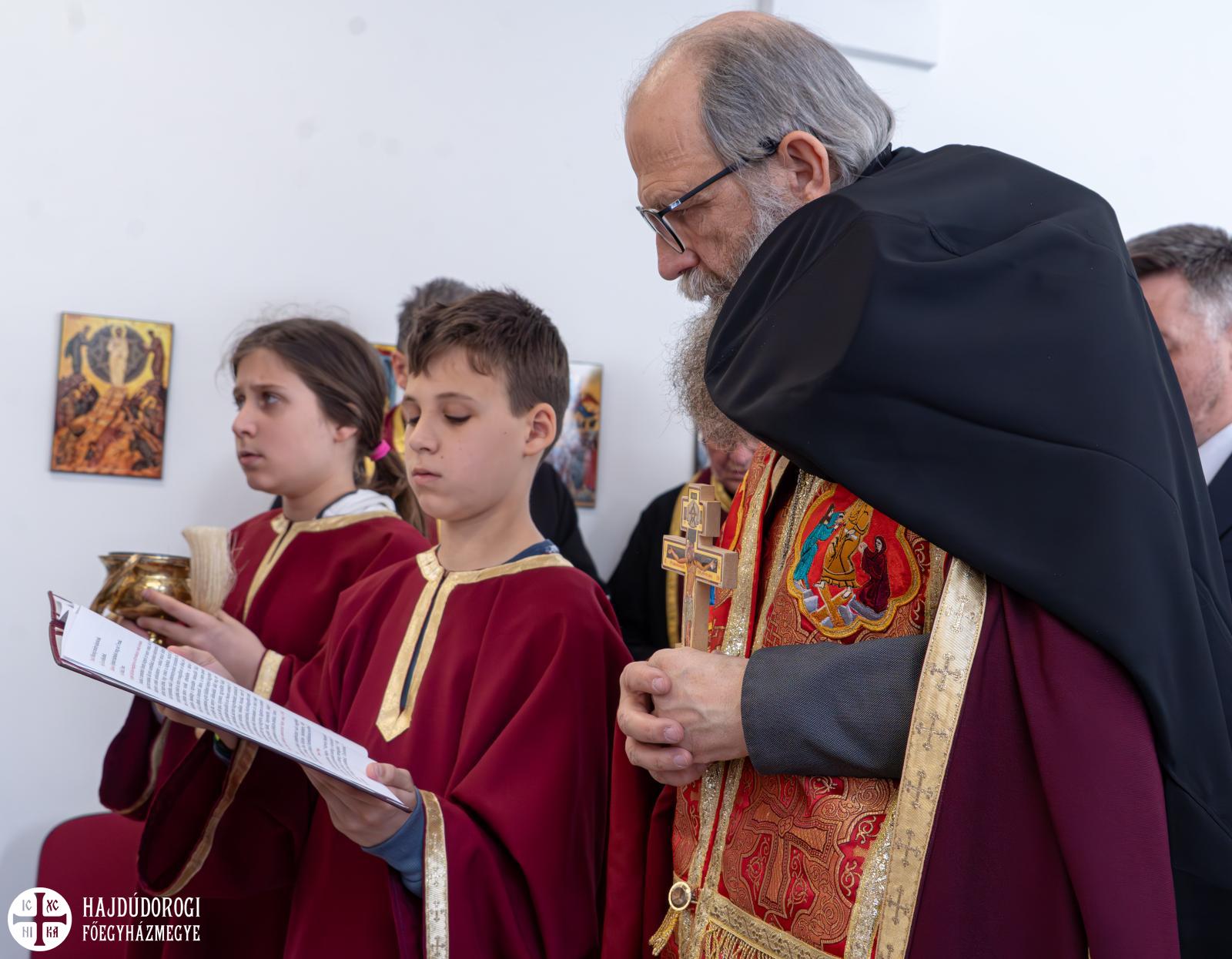 Kocsis Fülöp beszédében az ikonosztázion lényegére irányította a figyelmet. „Nem pusztán egy falról van szó – hangsúlyozta –, hanem egy olyan határról, amely egyszerre takar és feltár. Elválasztja a szentély titkát a szem elől, ugyanakkor segít megérteni, hogy az isteni valóság nem érzékelhető pusztán látással. Az ikonok mégis úgymond ablakká válnak: rajtuk keresztül bepillantást nyerhetünk a mennyországba, az üdvösség történetébe, és saját életünk céljába. Az ikonosztázion így nem elrejt, hanem mélyebb látásra tanít – arra, hogy szívünkkel fogjuk fel azt, amit szemünkkel nem láthatunk” – fogalmazott a metropolita.