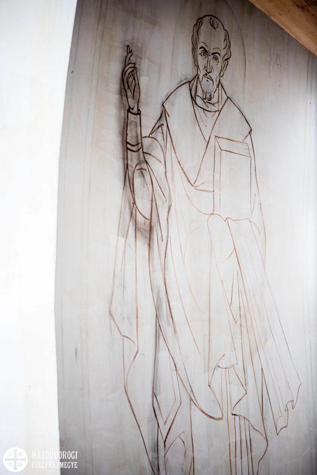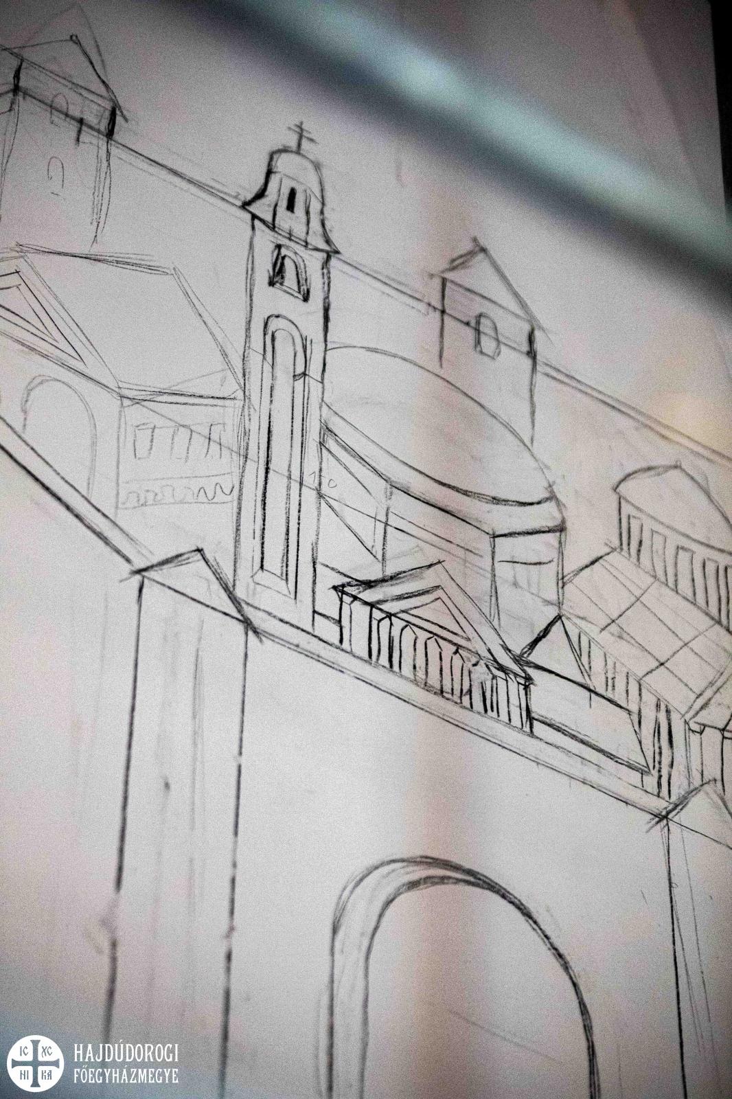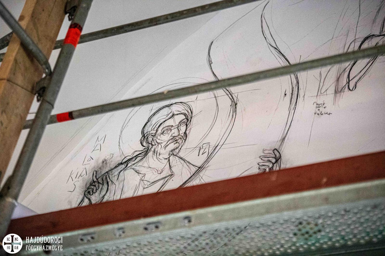 "Ezek egyelőre csak vázlatrajzok: a figurák méretét, mozdulatait, az egész térben való elhelyezkedésüket rögzítik ezek a képek. Csak később, a festés során fognak a részletek kialakulni" – magyarázza Seres Tamás, ikonfestő.