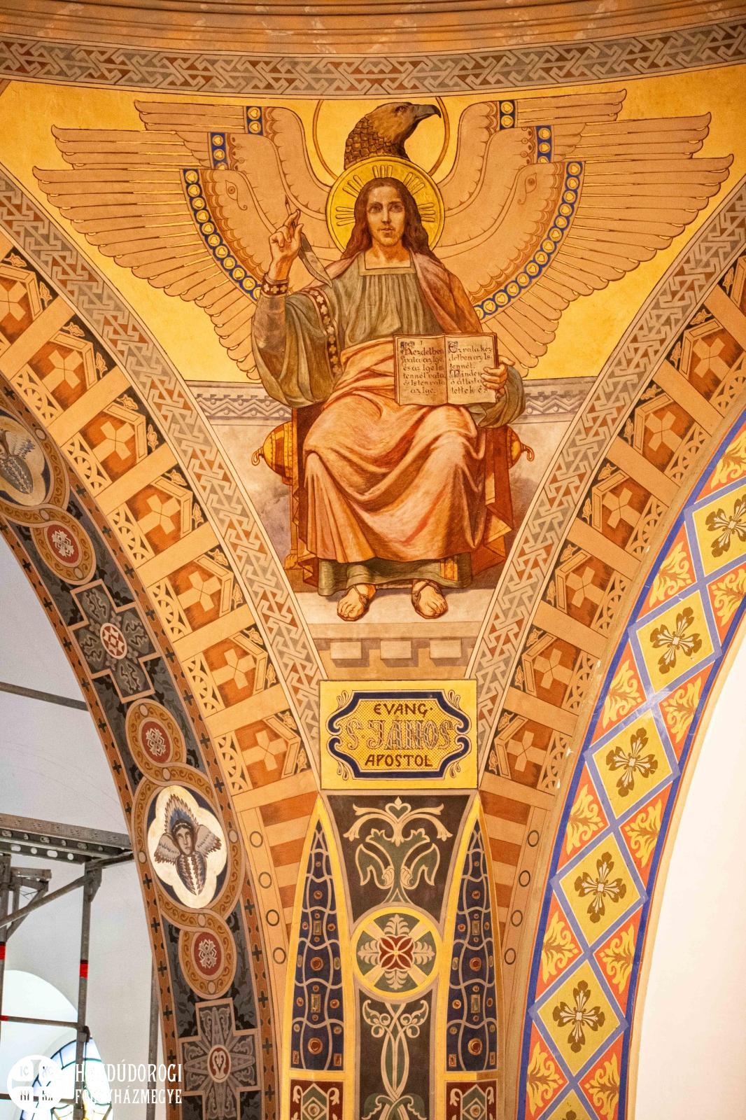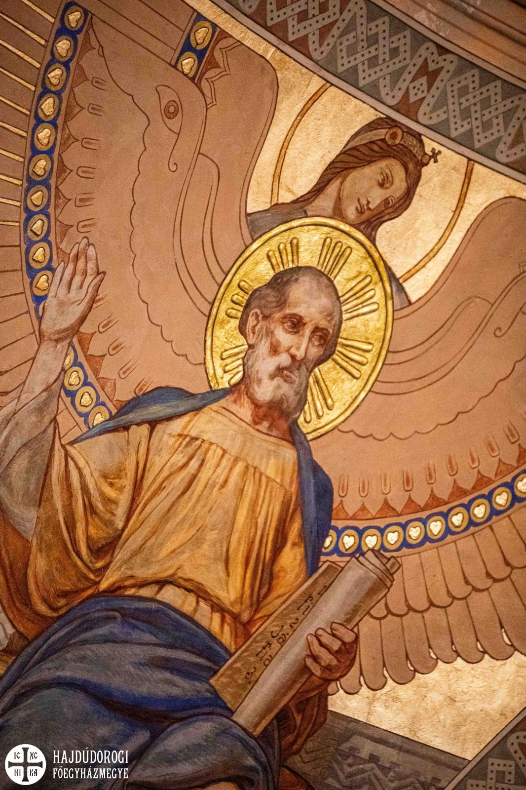 -Hát nem tudom, hogy kinek mi a meglepetés. Az az igazság, hogy túl sok szent nem fog helyet kapni a falakon, az építészeti adottságok miatt kevés helyen lehet állószentet vagy félalakos szentet elhelyezni. Ráadásul vannak olyan nevek, akiket még érsek atya nem is nevezett meg. Az ő döntésére várunk. Az ünnepi jelenetek sora az biztos. Újdonság lesz, hogy a baldachin fölött egy nagyméretű, félalakos Krisztus fog megjelenni az evangélisták szimbólumaival, egy arany háttér előtt. A templomba belépve remélem, hogy ez egy megkapó, felemelő látvány lesz. A hátsókarzat fölött egy nagy mennybemenetel fog helyet kapni, középen a mennybe menő Krisztussal, mögötte pedig az Istenszülő elszenderedése látható majd a nyugati falon, az is nagyon látványos lesz. Szerintem szépen vannak a jelenetek megkomponálva, bízom benne, hogy másoknak is elnyeri a tetszését.