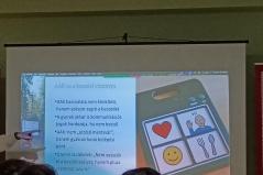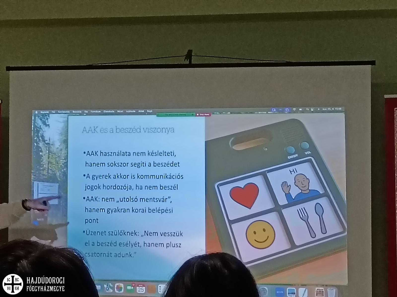 Az első előadás: „Alaplépés: az SNI-s gyermekek nyelvi és kommunikáció-fejlesztése” címet kapta. Az előadás első blokkjában a mai gyerekek beszéd- és nyelvfejlődésének kihívásairól (születés körüli tényezők, COVID-hatások, képernyőhasználat, digitalizáció, mesterséges intelligencia és nyelv) volt szó, a legújabb kutatások alátámasztásával és statisztikai adataival. A második rész témája pedig az SNI-s gyermekek kommunikáció- és beszédindítása magyar és nemzetközi módszerekkel; szenzoros és játékalapú megközelítésekkel volt. Az interaktív előadás logikus gondolkodásra ösztönözte a szakembereket, egyre bátrabban tippelték a statisztikai számokat. A megdöbbentő adatok olykor néma csöndet vagy mély sóhajt váltottak ki a hallgatóságból.