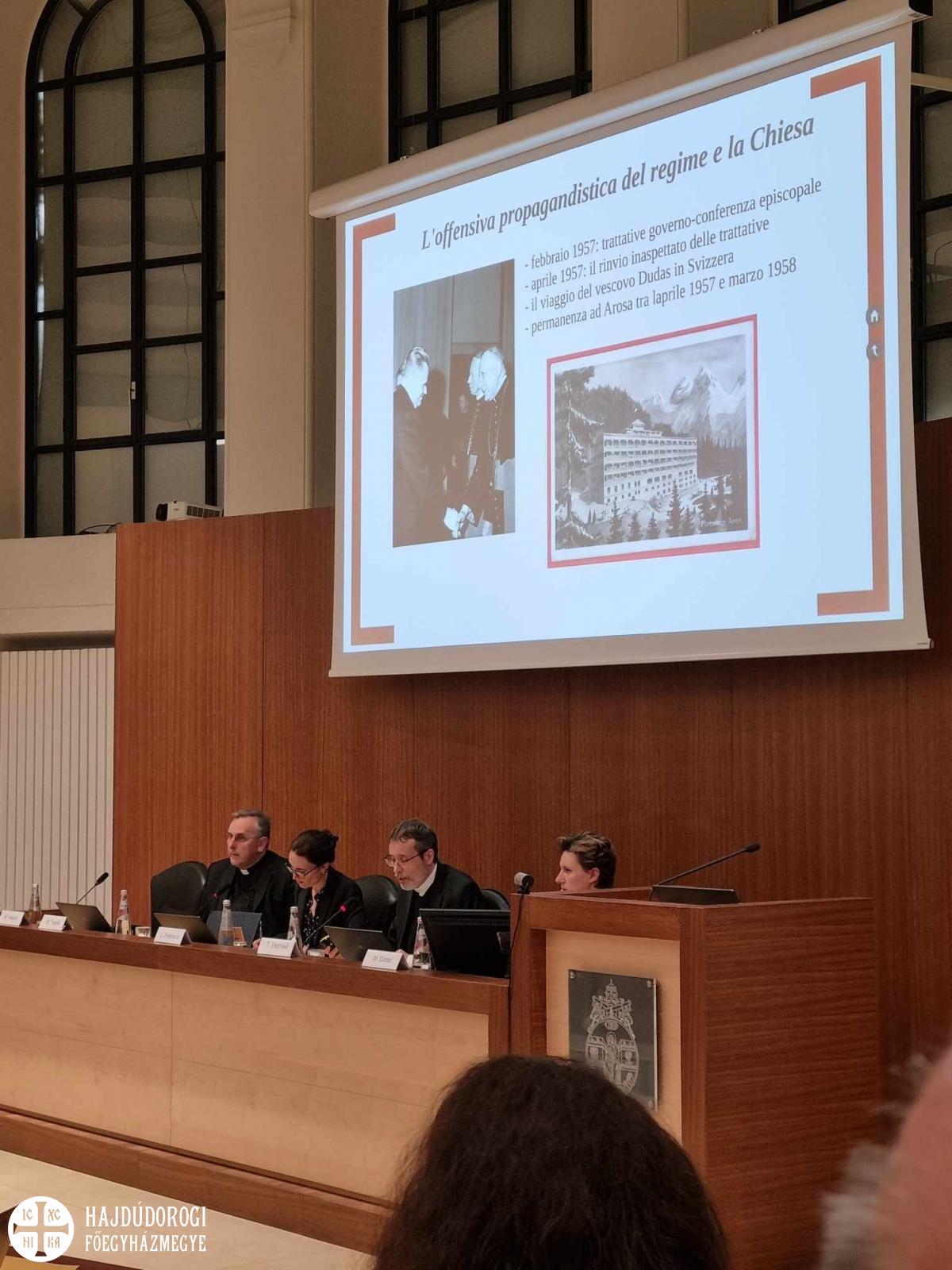 A konferencia ötödik szekciójában hangzott el Véghseő Tamás egyetemi tanár olasz nyelvű előadása. Az MTA-SZAGKHF Görögkatolikus Örökség Kutatócsoport vezető kutatója a magyar görögkatolikusok második világháború utáni történetén és Dudás Miklós hajdúdorogi megyéspüspök svájci gyógykezelésén (1957-1958) keresztül azt mutatta be, hogy az “ellenséges nyugat” és a “baráti Szovjetunió” egymásnak feszülése még a “béketábor” egy kicsiny közösségének, a magyar görögkatolikus egyháznak a sorsát is befolyásolta. 1949-1952 között a magyar görögkatolikus egyház felszámolásának kérdése - hasonlóan a szovjet érdekszférába került szomszédos görögkatolikus egyházakhoz - azért volt napirenden, mert a pápa személyében az egyház legfőbb vezetője az “ellenséges nyugaton” tartózkodott. Gyakorlati megfontolásból 1952 decemberében Moszkva elvetette a magyar görögkatolikus egyház felszámolásának lehetőségét. A “baráti Szovjetunióból” az a javaslat érkezett Budapestre, hogy a görögkatolikus egyháziakat a “békeharc” területén próbálják meg felhasználni, illetve fordítsák előnyükre azt az adottságot, hogy a magyar görögkatolikus egyház lényegében egyfajta “alagút”, melyen keresztül a Vatikán a keleti blokk országainak katolikusaival kapcsolatot tarthat. Amikor az 1956-os forradalom leverését követően az ENSZ napirendre vette a “magyar kérdést”, a nemzetközi legitimációért küzdő Kádár-rezsim propaganda-célokra még Dudás Miklós püspök súlyos tüdőbetegségét is megpróbálta felhasználni. A szentszéki diplomácia azonban felismerte a magyar kormány szándékait és megakadályozta, hogy a kádári propaganda elérje célját.