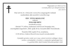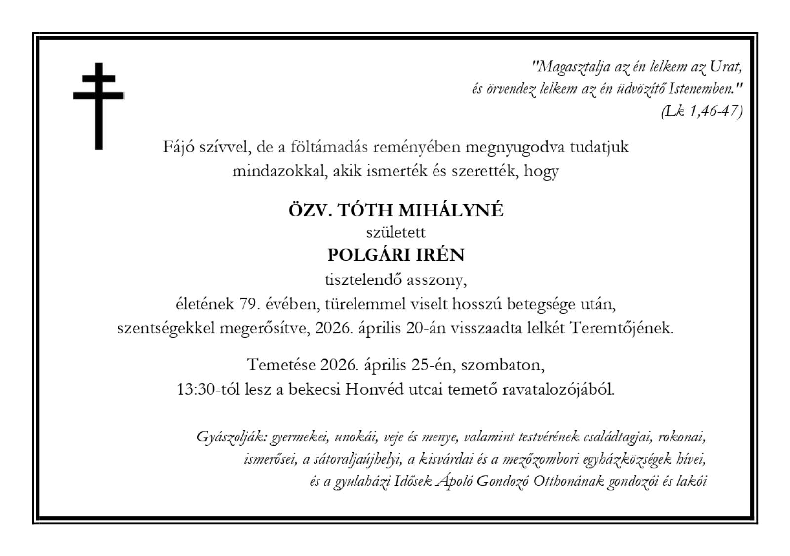Fájó szívvel, de a föltámadás reményében megnyugodva tudatjuk mindazokkal, akik ismerték és szerették, hogy Tóth Mihályné (született Polgári Irén) tisztelendő asszony, életének 79. évében, türelemmel viselt hosszú betegsége után, szentségekkel megerősítve, 2026. április 20-án visszaadta lelkét Teremtőjének.