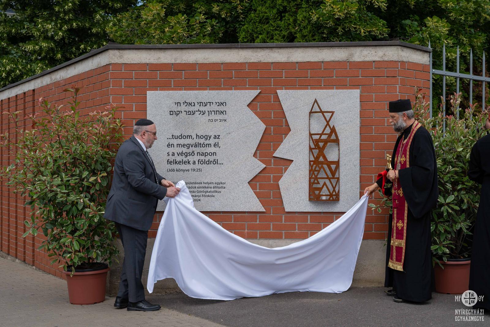 „Tudom, hogy az én megváltóm él, s a végső napon felkelek a földről” – hirdeti Jób könyvének szavait héber és magyar nyelven a márványtábla egyik fele, másik részén az átalakított Dávid csillag formavilágából építkező vas dombormű pedig egy mécsest ölel körbe. Az emléktábla a Szent Atanáz Görögkatolikus Hittudományi Főiskola kezdeményezésére a Magyar Zsidó Múzeum és Levéltár, a GBAM Partners Kft. és az Antiqua Kft. együttműködésével valósult meg. A táblát holokauszt magyarországi emléknapján Kocsis Fülöp görögkatolikus érsek-metropolita és dr. Frölich Róbert országos főrabbi közösen leplezték le, majd a hajdúdorogi érsek hintette meg szenteltvízzel. „Imádságban emlékezünk – kezdte beszédét a szertartás során Fülöp érsek, ha nem imádságban emlékeznénk, akkor mindaz, ami fájó, újra fáj. Gyógyulni csak az Isten segítségével lehet.”