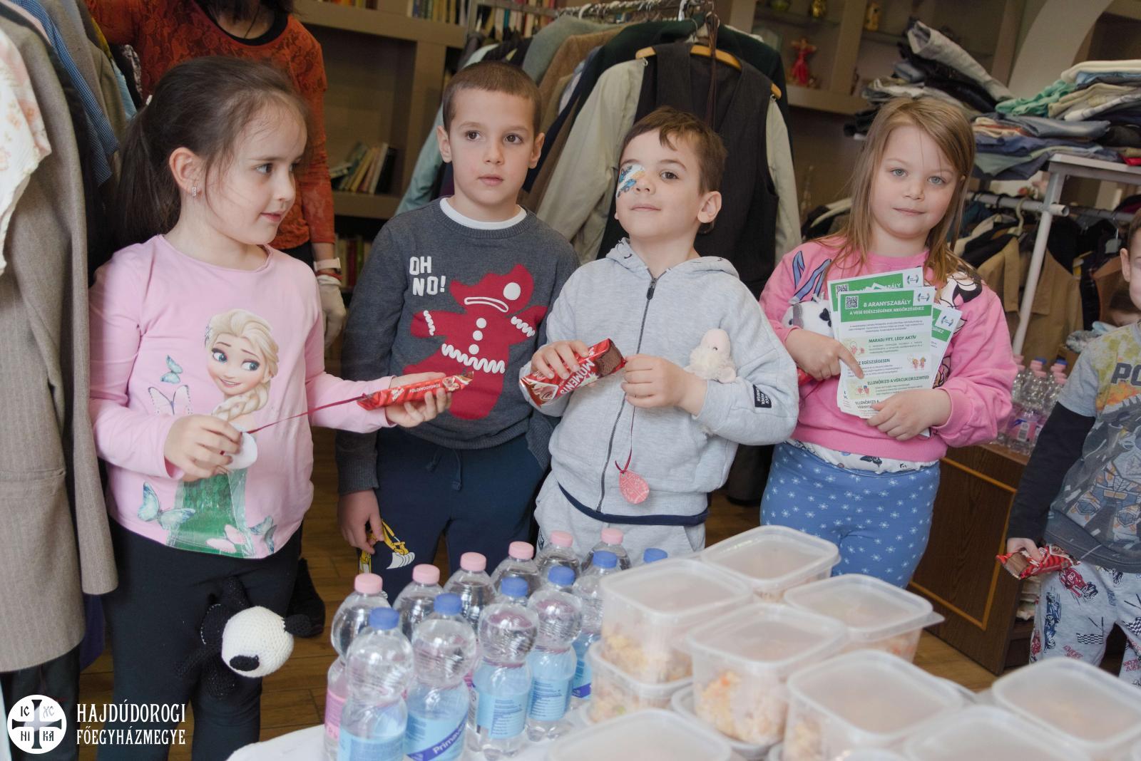 Az étel, a víz és a szórólap kiosztásában a Katica és a Maci csoport óvodásai is segítettek. A szolgáltatópont munkájáról és feladatairól Jaczkó Dániel atya, a főegyházmegyei karitász vezetője mesélt a gyerekeknek, hangsúlyozva, milyen fontos, hogy segítségére legyünk azoknak, akiknek nem telik ételre, italra, megfelelő ruházatra. Papp Anita, a szolgáltatópont munkatársa pedig egy rövid mesével szemléltette, hogyan segíthetünk másoknak kinőtt ruhadarabjaink elajándékozásával.