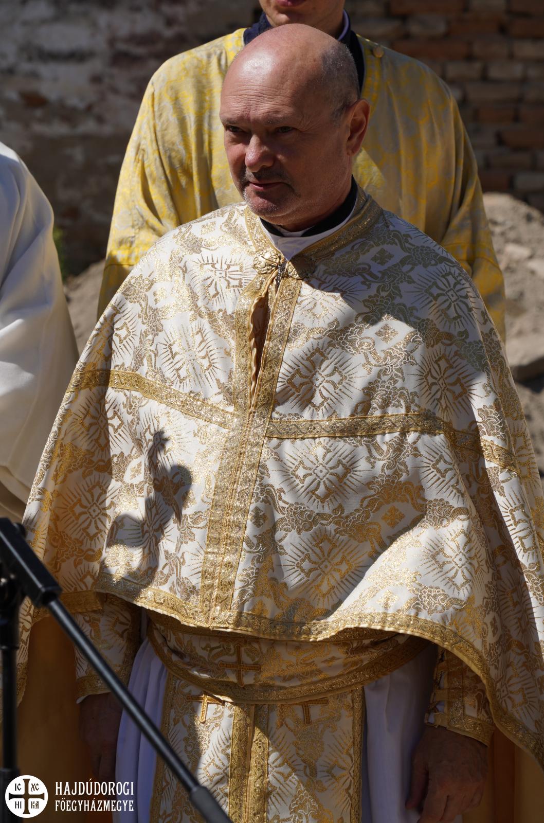 „Azért jöttünk ma Kecskemétre, hogy mélyre ássunk” – kezdte szentbeszédét Fülöp atya a már megkezdett építkezésre utalva. De ezt az ásást nem most, hanem 17 évvel korábban, a szervezőlelkészség létrehozásakor megkezdték, amikor a római katolikus atyák fogadták be templomukba a görögkatolikusokat. A vasárnapi evangéliumi szakaszban két ember szorult helyzetéről volt szó. Egyikük felelőtlen módon nagy tartozást halmozott fel. Mi, emberek sokszor a kisebbnek gondolt bűnökkel, megalkuvással halmozunk fel adósságot, „falat emelünk Isten és magunk közé”. „Ahhoz, hogy ez a templom Isten háza, a szeretet katedrálisa legyen itt Kecskeméten, ahhoz mélyre kell ásnunk szívünkben, ahol ott van az isteni szeretet. Építkezzünk ebből a szeretetből!” – zárta prédikációját Fülöp atya.