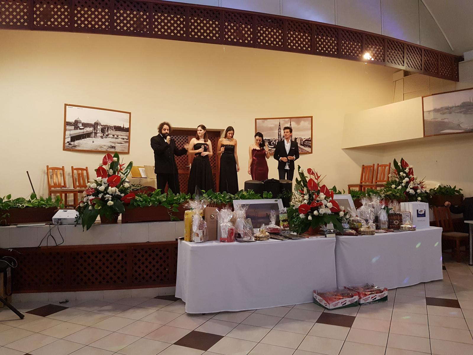 A mintegy száz fős együtt ünneplő vendégsereg két fellépőt hallgatott a bálon, a Windsingers acapella együttest, akik az utóbbi években jelentős hazai és nemzetközi sikereket értek el, és az AranyEzüst Quartett-et, a Szegedi Szimfonikus Zenekar művészeinek vonósnégyesét. Mindkét előadás rendkívül színvonalas és szórakozató volt, és kiemelendő, hogy mindkét társulat a műsorával támogatta az alapítványt. Ezúton is még egyszer köszönjük nekik! Az előadások után következett az este csúcspontja, az alapítvány most alapított díjának átadása, melyet a szegedi görögkatolikusokért végzett munkájáért fogja kapni minden évben egy ember.