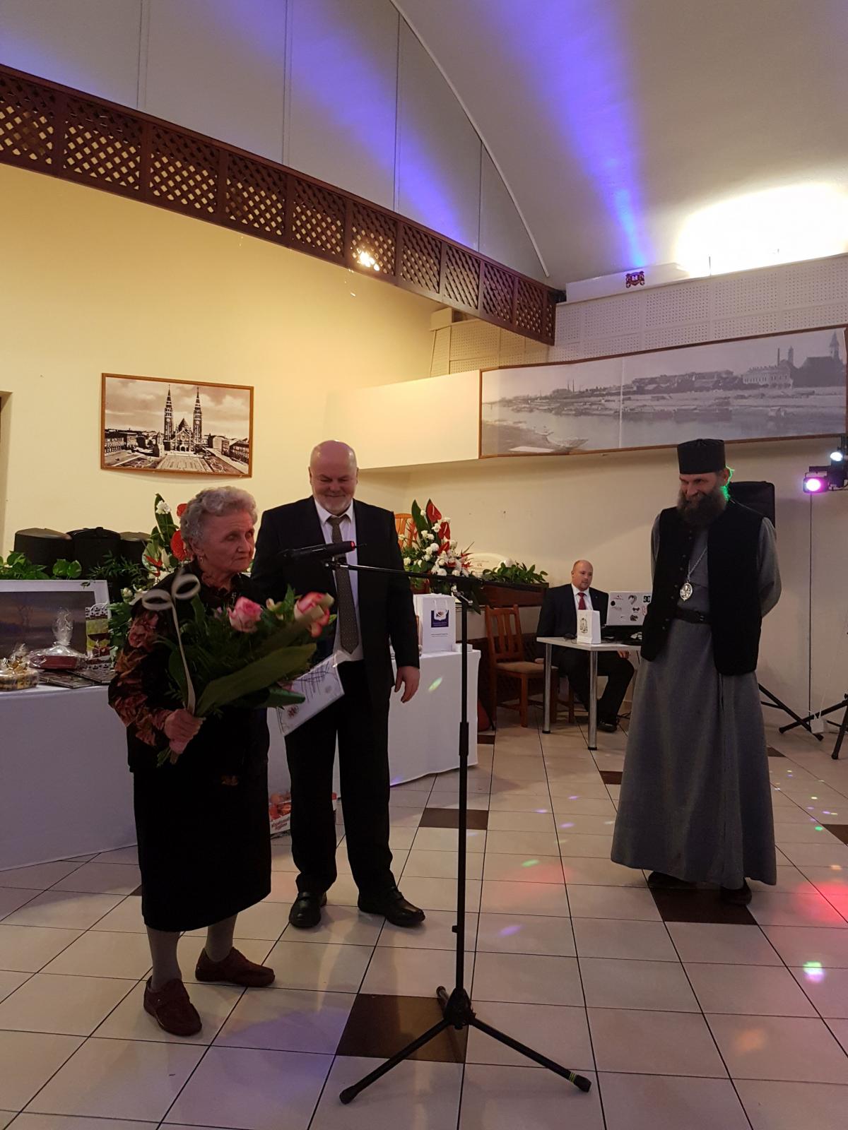 Mostani ünnepségünkön azonban két jutalmazott is akadt, a díj elindulásaként. Szaplonczay Miklós parókus atya és dr. Fedor István világi elnök közös felvezetésével találtuk ki, hogy az első díjazottunk a már említett Dr. Kerek Mária Magdolna. Marika néni az egyházközség szertartásainak, mind hétköznap, mind vasárnap, lelki és szellemi programjainak állandó résztvevője és támogatója. Köszönjük, hogy jelen van közöttünk!