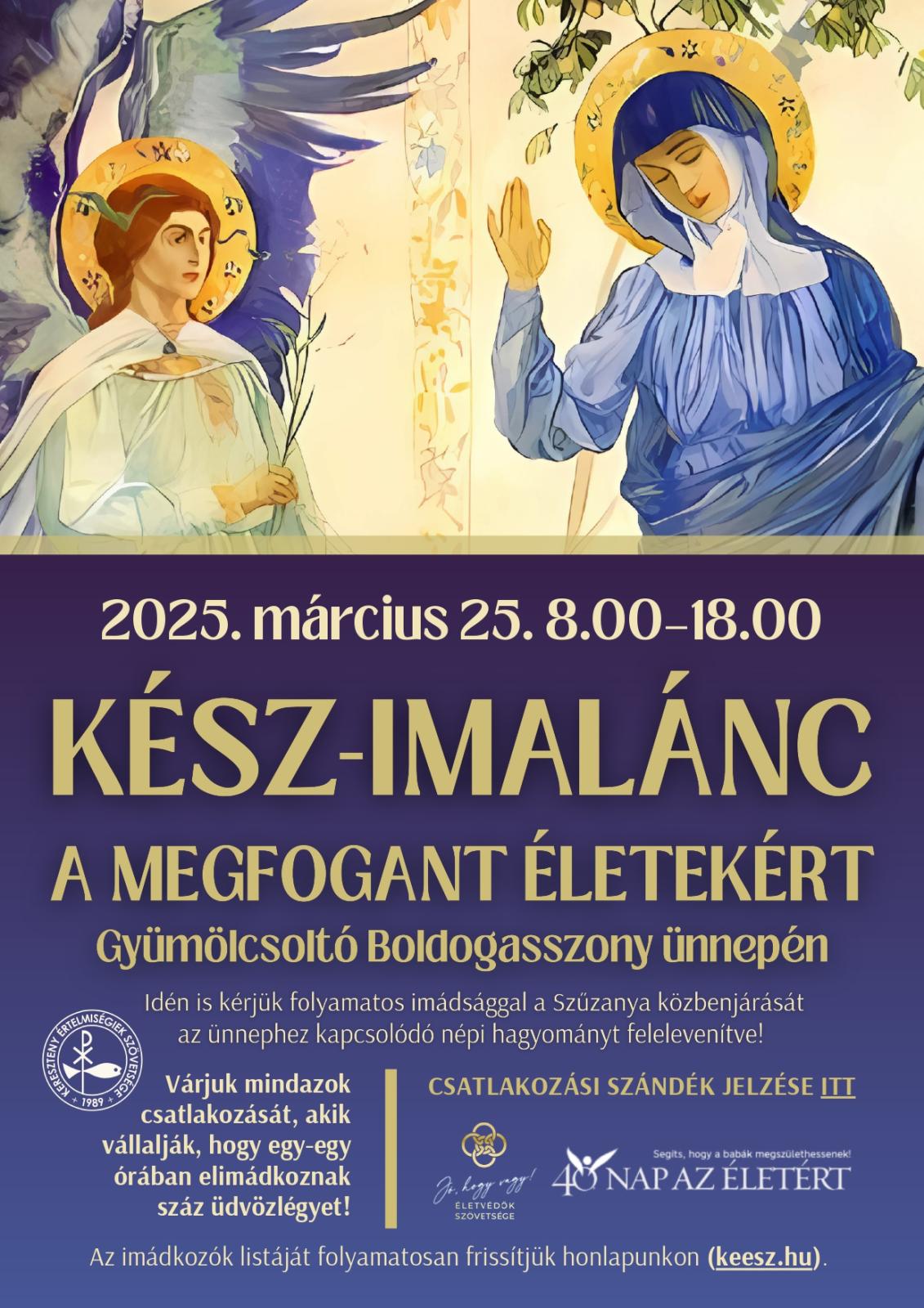 Idén is kérjük folyamatos imádsággal a Szűzanya közbenjárását március 25-én, kedden reggel 8 és este 6 óra között!