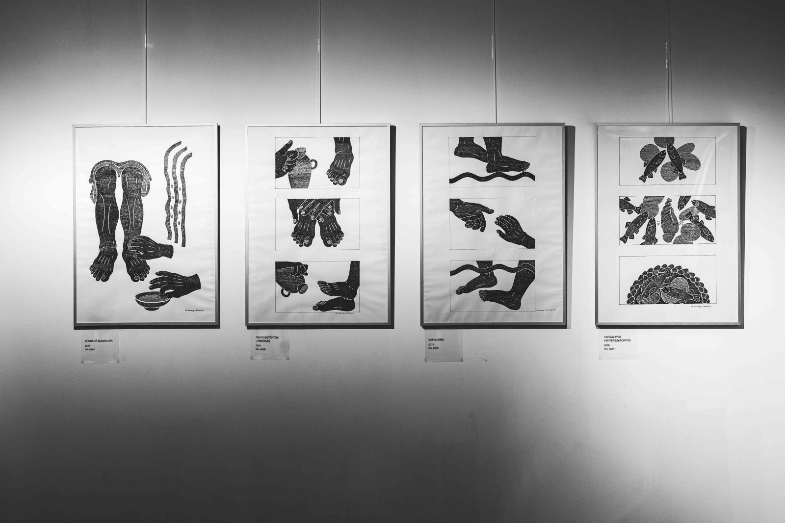 A művész fekete-fehér grafikái megtévesztőek: első pillantásra akár fametszeteknek is gondolhatnánk őket, ám közelebbről szemlélve kiderül, hogy aprólékosan kidolgozott tollrajzokról van szó. A felületeket sűrűn egymás mellé rendezett fekete vonalak alkotják, amelyek egységes, textilszerű hatást keltenek. Az alkotó hosszú keresés eredményeként jutott el ehhez az eljáráshoz: korábban más műfajokkal és technikákkal is kísérletezett, készített textilalapú munkákat, tanult ikonfestést is, míg végül rátalált arra a kifejezésmódra, amely leginkább megfelel belső alkatának és szellemi törekvéseinek.