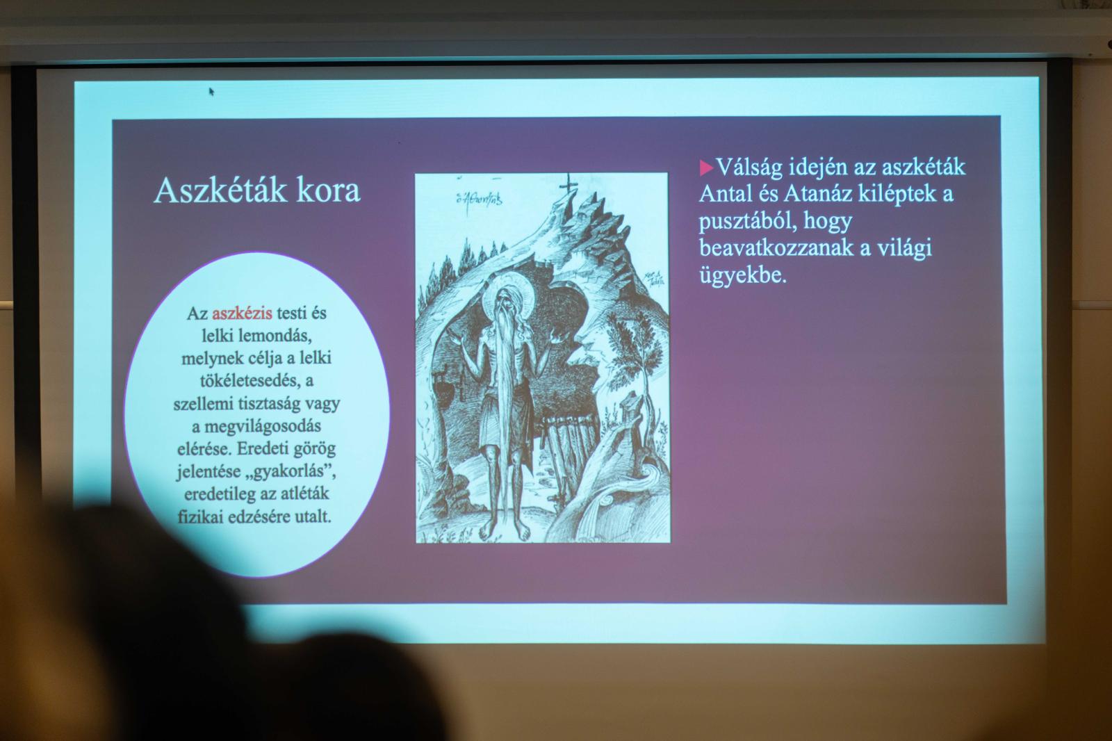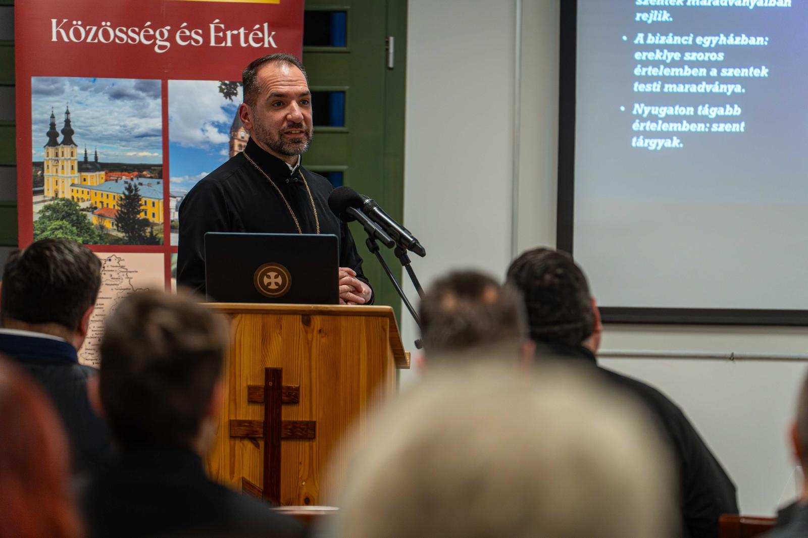 Dobos András teológus, főiskolai tanár a bizánci egyház ereklyetiszteletéről beszélt. Mint elmondta, a nyugati egyházban ereklyének nevezik a szentek ruháit vagy a hozzájuk kapcsolható tárgyi emlékeit is, a keleti egyházban azonban a szentek testi maradványait tekintjük ereklyének. Régészeti és írásos bizonyítékok szerint a szentek földi maradványainak tisztelete már az első századokban megjelent. A kereszténység szabaddá válását követően a vértanúk sírjai fölé martyriumokat, mauzóleumokat emeltek. A sírokat gyakran fölnyitották, a maradványokat új, nagyobb templomokba vitték. Az újbóli keresztényüldözések során, amikor tiltva lett a szentek sírjainak látogatása, gyakran magukkal vitték a szentek csontjait a keresztények, hogy erőt merítsenek belőlük, és megóvják a pusztítástól.