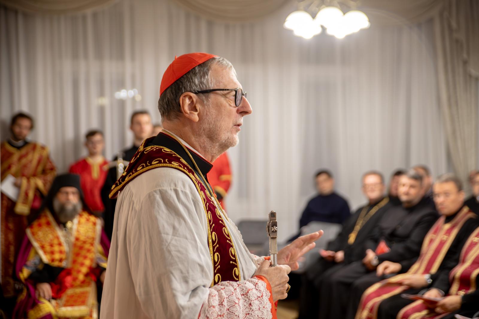 Claudio Gugerotti bíboros már beszéde elején családias hangulatot teremtett, hiszen elárulta, magyar vér is csörgedezik az ereiben. Első alkalommal papszentelése után nem sokkal látogatott hazánkba, ekkor egy egészen más világba csöppent, mint amilyen a mostani Magyarország. Titokban, három zárt ajtó mögött egyedül kellett elmondania a napi szentmisét. Ma pedig, ötven évvel később “nem becsuknom kell itt ajtókat, hanem megnyithatom egy új kulturális központ ajtóit a hívek és a közönség előtt. Valami gyökeresen megváltozott Magyarországon az elmúlt években, és ez az Isten műve. Az ő kegyelmének fantáziája végtelen.”