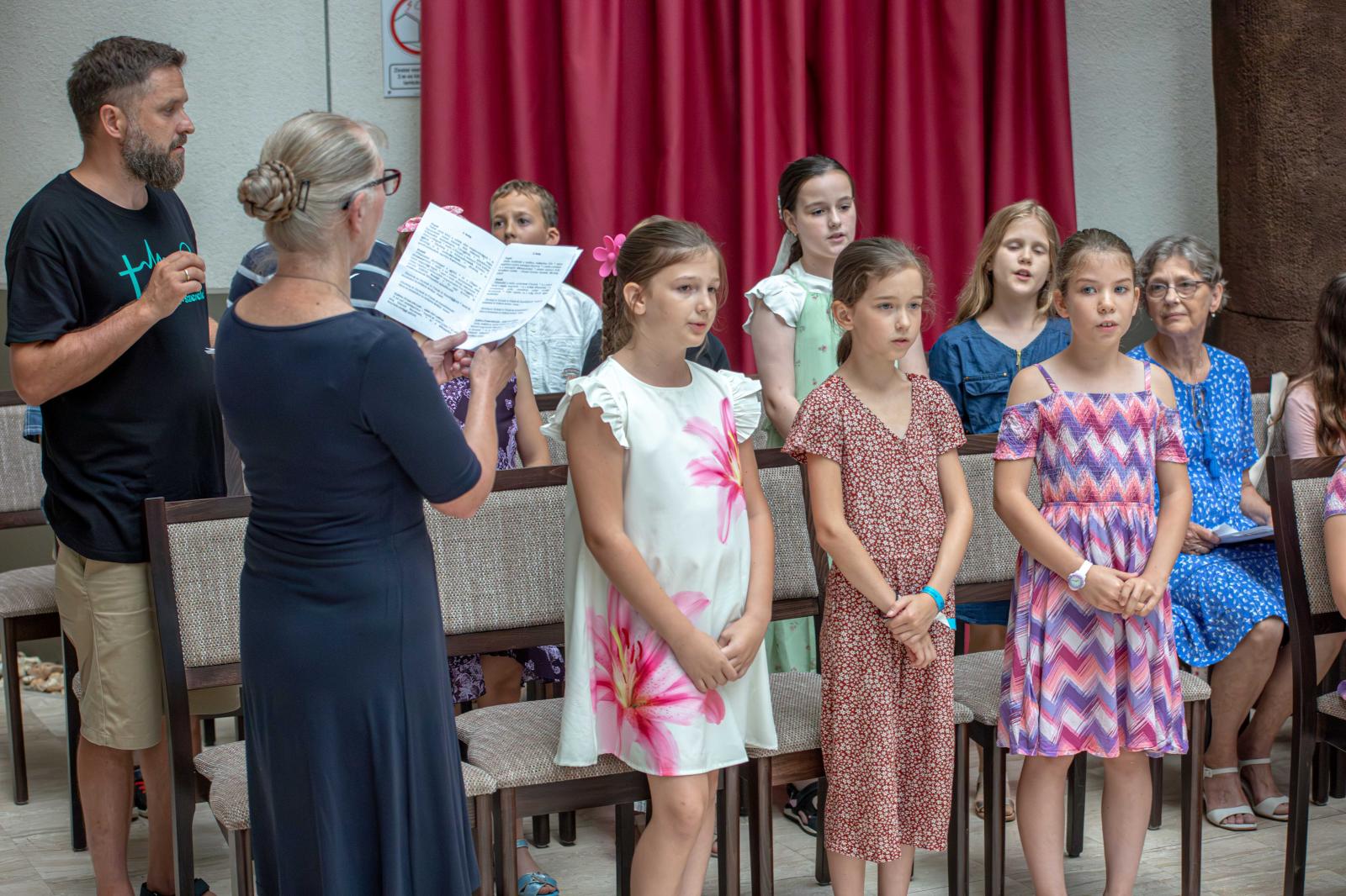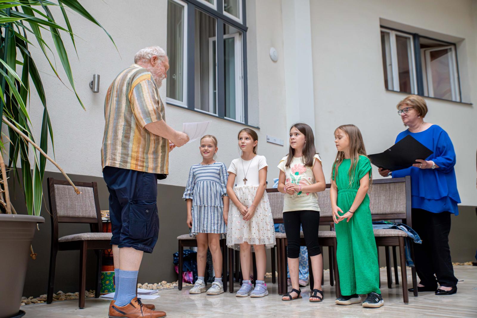 Radics Teréz és Bubnó Tamás már több alkalommal vezette a legkisebbek öröméneklését. A néhány éve még az ő csoportjukba tartozó gyerekek közül páran most a legnagyobbak között énekeltek. A mostani, 2-3. osztályosokból álló csapat a tropárokkal és kontákokkal foglalkozott héten. Ezekből adtak ízelítőt az utolsó estén, mellette pedig kánonokat és Nyári rondó címmel egy vidám népdalcsokrot is elénekeltek.