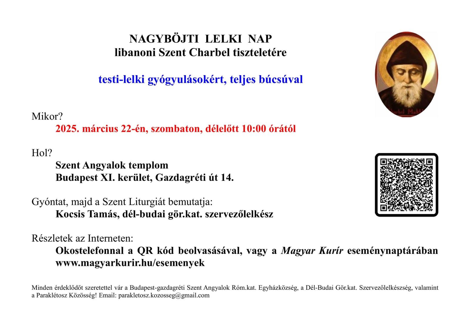 A lelki nap szervezője a Budapest-gazdagréti Szent Angyalok Római Katolikus Egyházközség, a Dél-Budai Görögkatolikus Szervezőlelkészség és a Paraklétosz Közösség. Szent Liturgiát mutat be Kocsis Tamás dél-budai görögkatolikus szervezőlelkész.