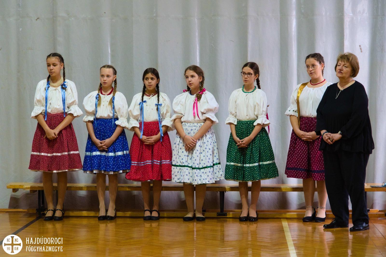 Népdalkincseinkből adott ízelítőt az iskola 6.B osztályos tanulóiból álló Cserfes énekegyüttes. A leányok Radics Teréz énektanár vezetésével erdélyi népdallal és bihari népdalcsokorral alapozták meg a verseny hangulatát.