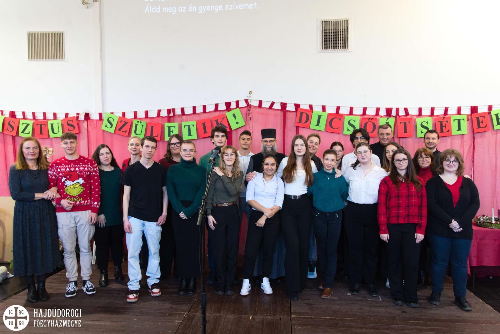 Az ünnepség kezdetén karácsonyi katavásziákat énekeltek a jelenlévő pedagógusok, tanulók Kocsis Fülöp metropolitával és az intézmény két egyházi szolgálattevőjével, Szilágyi Gábor és Papp András atyával közösen. Ezután Fülöp atya gyújtotta meg az utolsó gyertyát is az adventi koszorún.