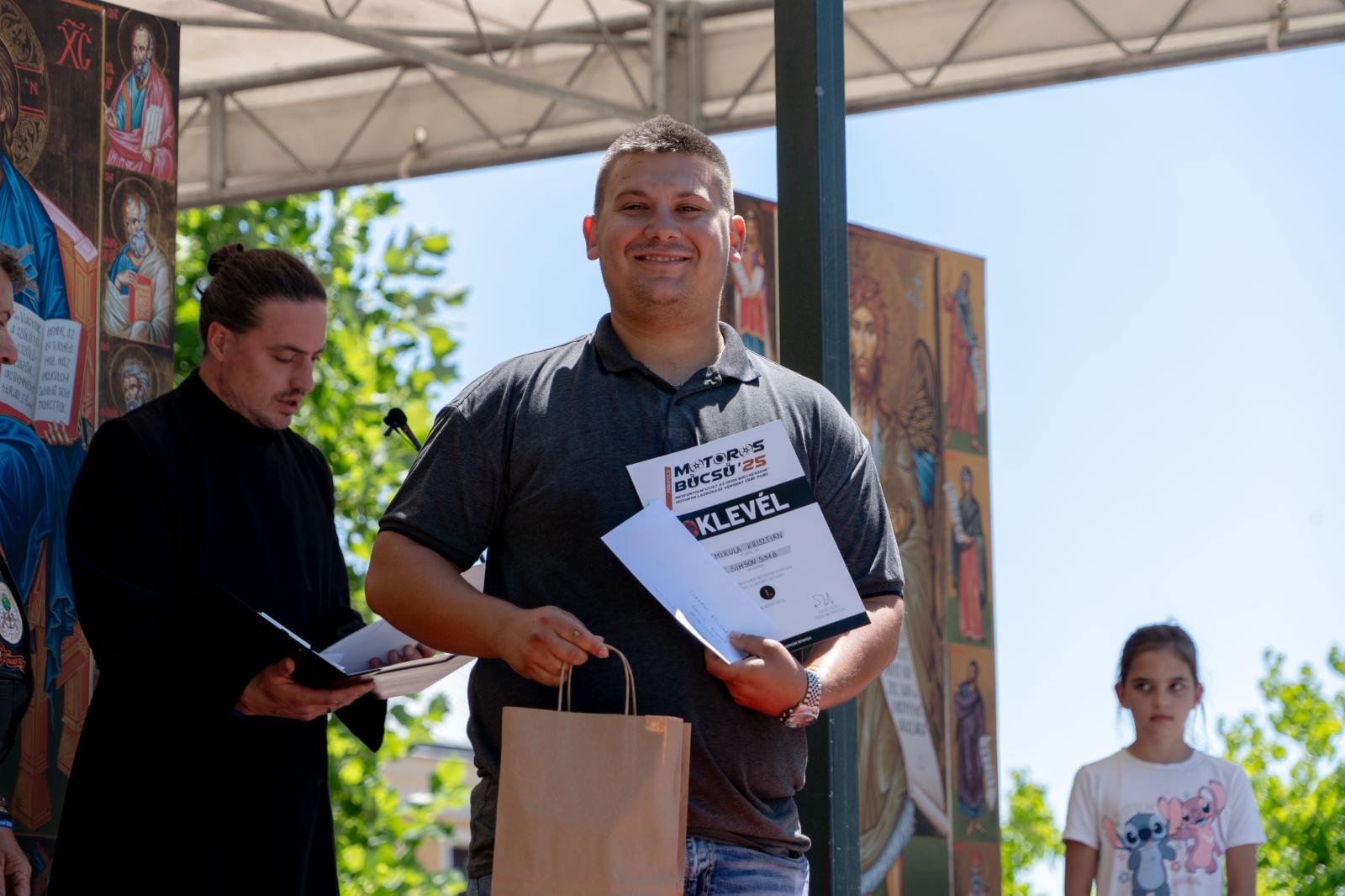 A Szent Liturgiát követően hirdették ki a versenyek győzteseit. A hangnyomásversenyen a 800 köbcenti alatti motorok között 3. helyen a debreceni Gellért Zoltán és Yamahája végzett. Második lett Mátyás Krisztián Gégényből Suzuki Banditjával. A győztes a Gulácsról érkezett Szilágyi Sándor lett 105,1 decibeles teljesítménnyel.