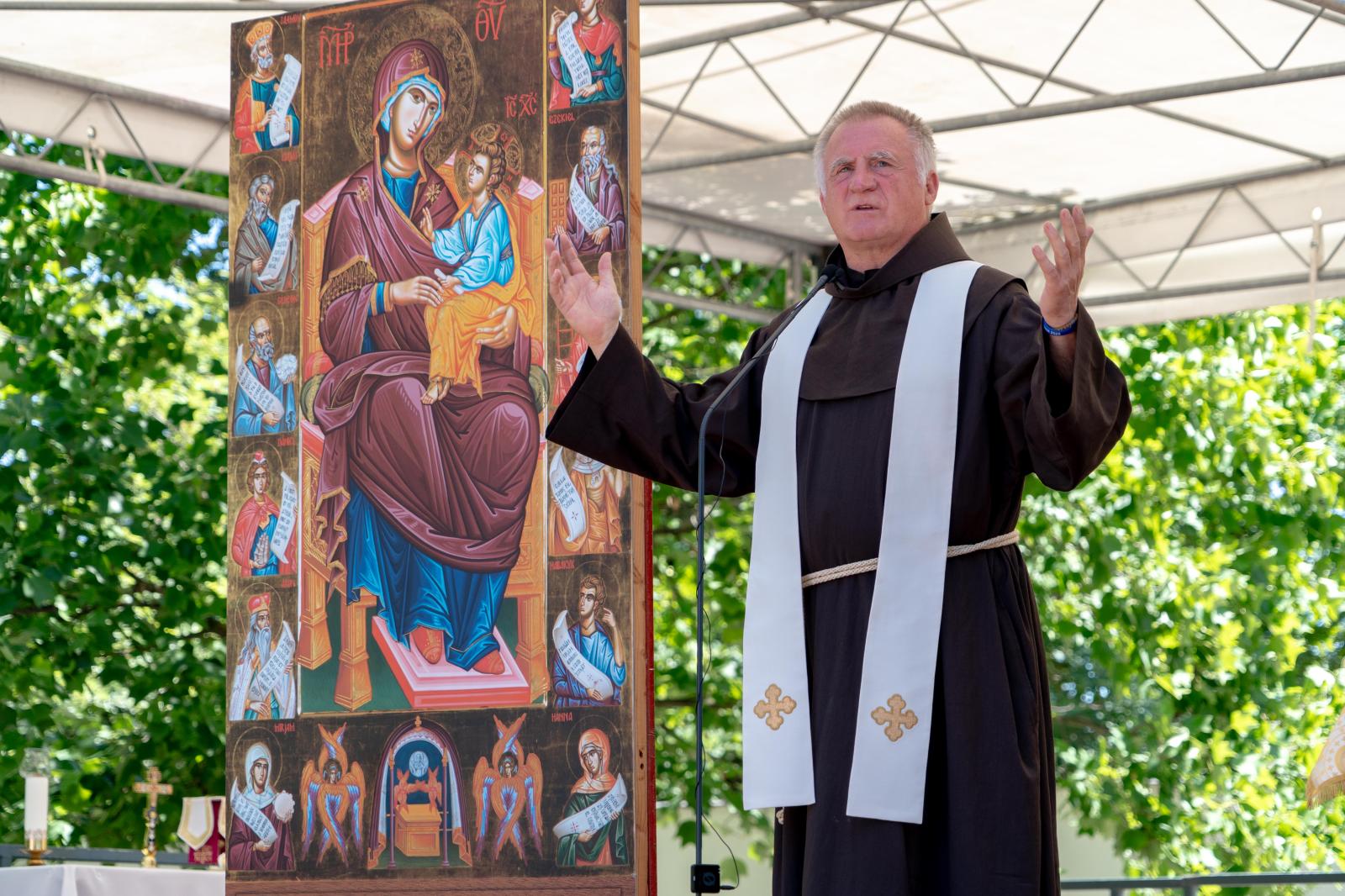 A versenyeket követően minden résztvevő a tábori oltár előtt sorakozott fel. Haramura Béla, Ignácz András és Karakó Roland atyák motoros felszerelés helyett papi ruhát öltöttek magukra – ők celebrálták a búcsúi Szent Liturgiát, Turjanica János papnövendék pedig a kántori szolgálatot vállalta. Az ünnep főszónoka Böjte Csaba atya volt, aki a remény szentévéről mondott tanítást a több mint 200 résztvevő számára. Szent Ágoston gondolatát idézve kiemelte: ahol nincs remény, ott nincs kereszténység sem. A remény isteni erény, ami olyan, akár az izom: ha használjuk, megerősödik, ha nem használjuk, elsorvad. Jézus élete folyamatos zarándoklat volt, amit azért vállalt, hogy megtanítson bennünket a szeretet parancsára. Hogy jobb szeretetben élni, mint háborúban. Ha nem hitt volna abban, hogy képesek vagyunk ezt megtanulni, együtt, vállvetve építeni Isten országát, nem jött volna el közénk. Az élő hit a lehetetlennek tűnő helyzeteket is képes lehetségessé tenni. Ez a változás kulcsa is. A legnagyobb Szentlélek elleni bűn pedig maga a reménytelenség. Mint mondta: a motoros zarándoklat is a reményt hirdeti.